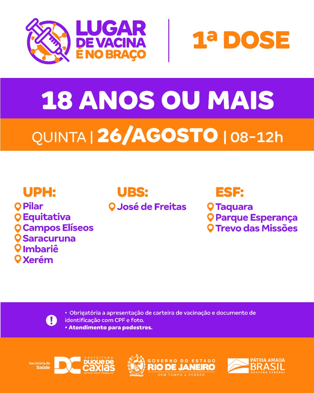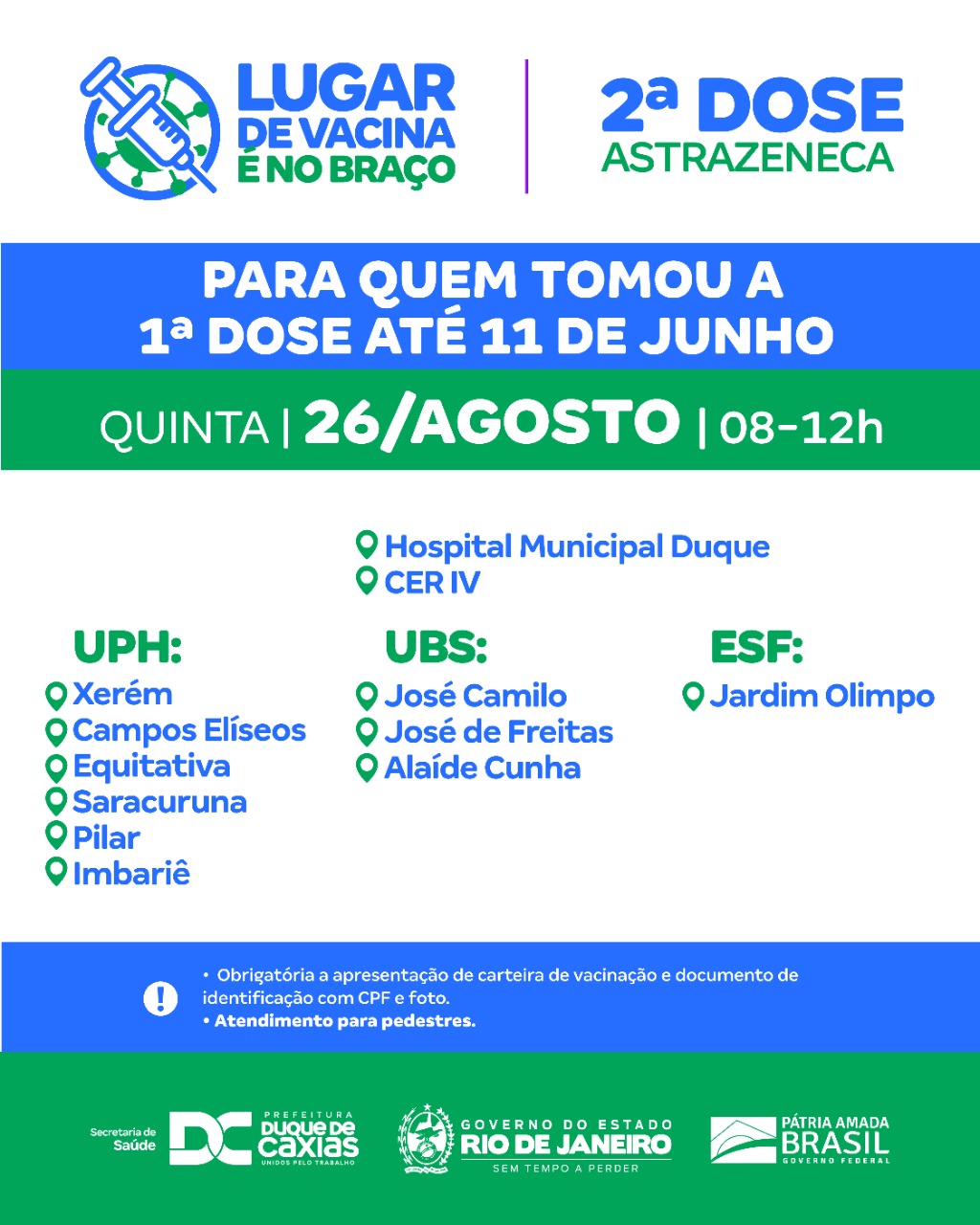 A Prefeitura de Duque de Caxias, através da Secretaria Municipal de Saúde, realiza nesta quinta-feira (26/08) a vacinação de primeira dose para quem tem 18 anos ou mais e convoca para a segunda dose de Astrazeneca, todas as pessoas que receberam a primeira dose até a data de 11 de junho.