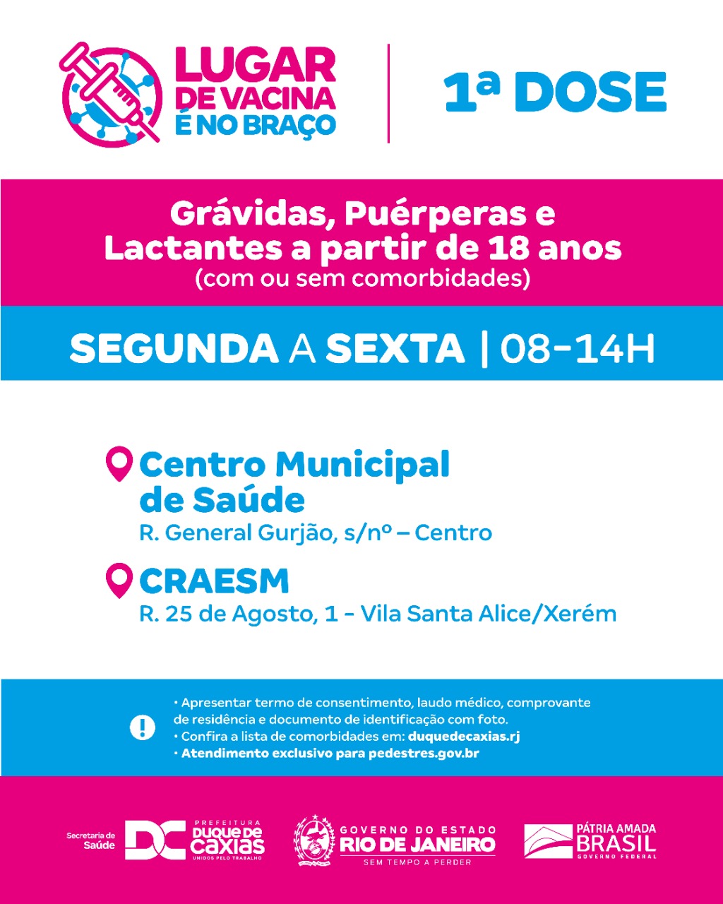 * Primeira Dose para Gestantes, Puérperas e Lactantes - O município segue ainda com a aplicação da primeira dose para Gestantes, Puérperas e Lactantes, com idade acima de 18 anos, de segunda a sexta-feira, das 8h às 14h, no CMSDC- Centro Municipal de Saúde (Av. General Gurjão – Centro) e no CRAESM de Xerém (Rua 25 de Agosto – Vila Santa Alice – Xerém). As gestantes e puérperas devem apresentar o laudo médico do obstetra. As lactantes devem apresentar comprovação. Nos três casos é obrigatória, ainda, a apresentação de documento de identificação com CPF e comprovante de residência.