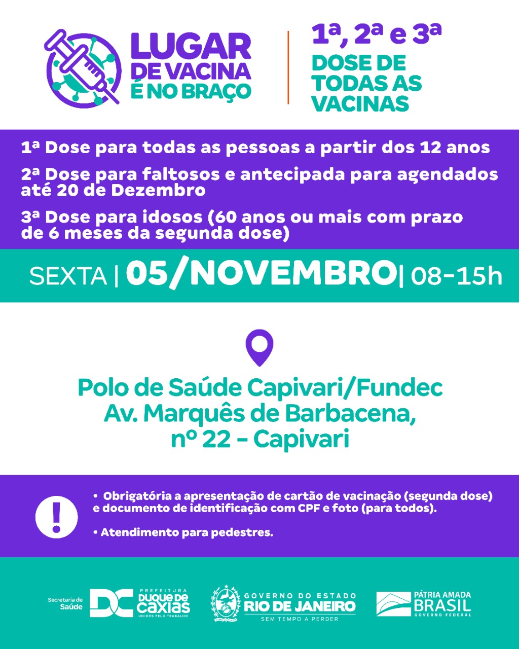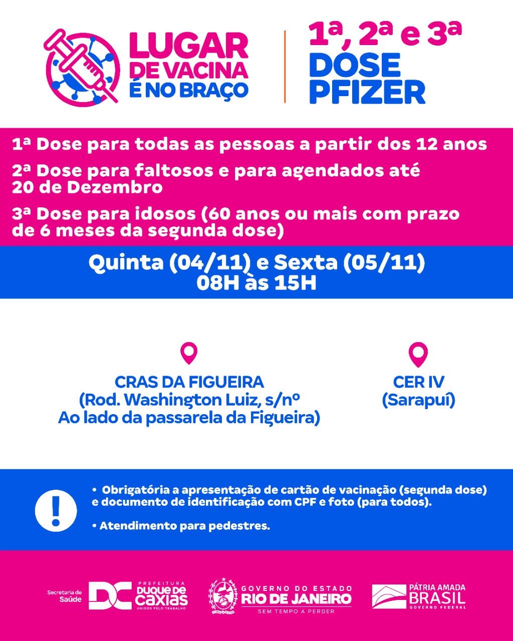 A vacinação com a primeira, segunda e terceira doses de todas as vacinas (Coronavac, Astrazeneca e Pfizer) também segue até a sexta-feira (05/11), das 8h às 15h, no Hospital Municipal Duque, UPH Campos Elíseos, UPH Equitativa, UPH Imbariê, UPH Pilar, UPH Saracuruna, e UPH Xerém. Poderão receber as vacinas os seguintes grupos: primeira dose para todas as pessoas a partir dos 12 anos; segunda dose para faltosos e quem está no prazo de todas as vacinas; e terceira dose (reforço) para idosos (60 anos ou mais com prazo de 6 meses da segunda dose).