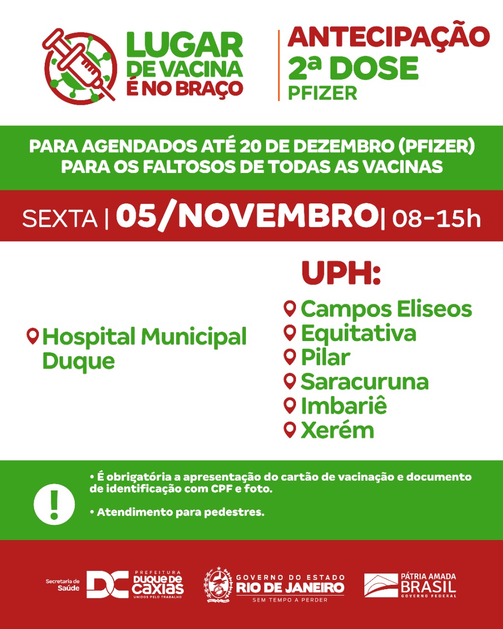 A Prefeitura de Duque de Caxias, através da Secretaria Municipal de Saúde, estará vacinando nesta sexta-feira (05/11) com a segunda dose de Pfizer antecipada, para aqueles que estão agendados até 20 de dezembro, e a segunda dose para os faltosos de todas as vacinas (Coronavac, Pfizer e Astrazeneca), das 8h às 15h, nos seguintes locais: Hospital Municipal Duque, UPH Campos Eliseos, UPH Equitativa, UPH Pilar, UPH Saracuruna, UPH Imbariê e UPH Xerém.