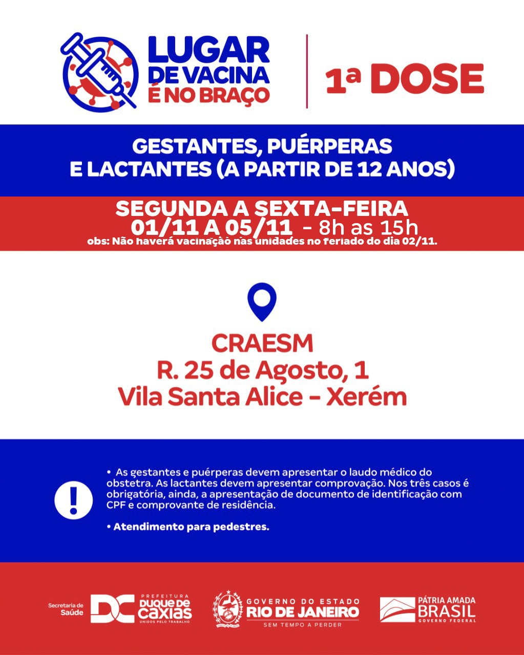 No CMSDC - Centro Municipal de Saúde (Av. General Gurjão – Centro), a vacinação segue, até sexta-feira (05/11), para os seguintes grupos: primeira dose para gestantes, puérperas e lactantes (a partir de 12 anos). Este grupo também pode ser vacinado no CRAESM de Xerém; segunda dose para faltosos de todas as vacinas; e terceira dose (reforço) para pessoas imunossuprimidas e idosos (com 60 anos ou mais com prazo de seis meses da segunda dose). Verifique a lista das imunodeficiências que podem receber a dose de reforço da vacina contra a Covid-19, no site da Prefeitura: (www.duquedecaxias.rj.org.br).