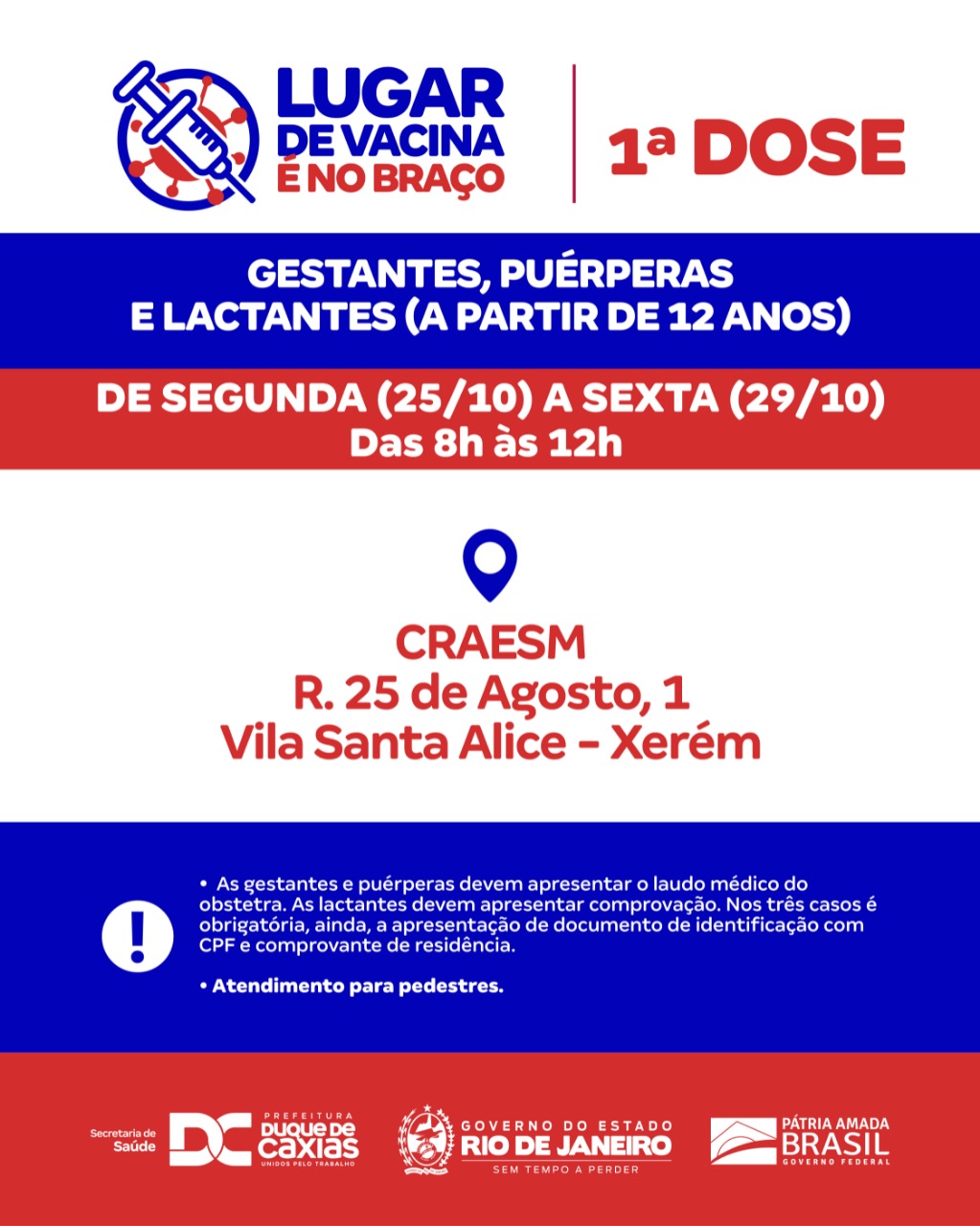 No CMSDC - Centro Municipal de Saúde (Av. General Gurjão – Centro), a vacinação também segue, até sexta-feira (29/10), com a primeira dose para gestantes, puérperas e lactantes (a partir de 12 anos). Este grupo também pode ser vacinado no CRAESM de Xerém; segunda dose para faltosos de todas as vacinas; e terceira dose (reforço) para pessoas imunossuprimidas e idosos (com 60 anos ou mais com prazo de seis meses da segunda dose). Verifique a lista das imunodeficiências que podem receber a dose de reforço da vacina contra a Covid-19, no site da Prefeitura: (www.duquedecaxias.rj.org.br).