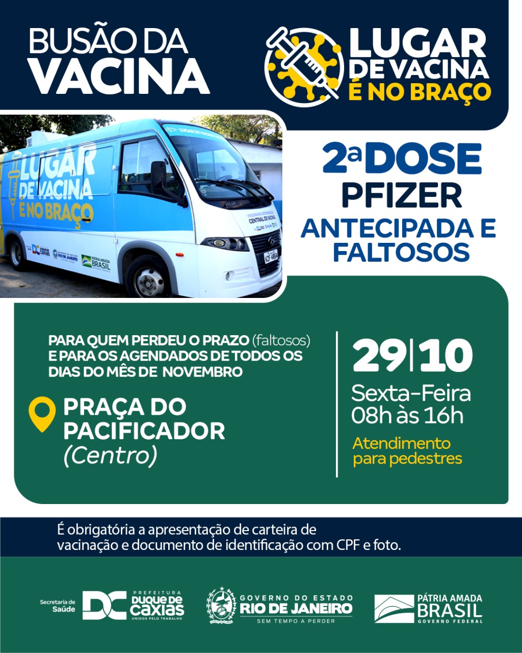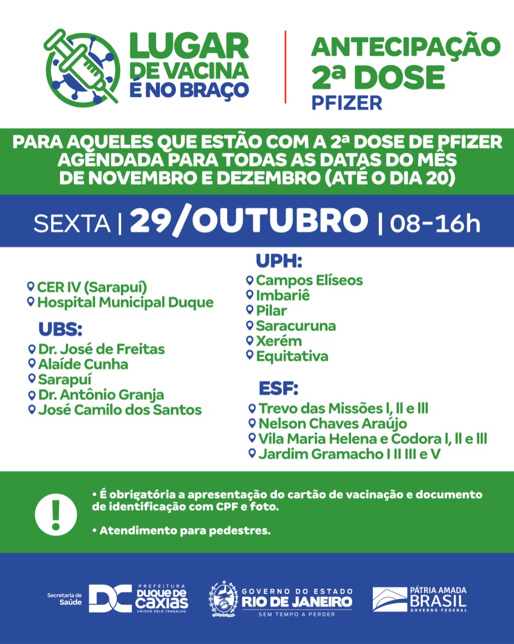 Nesta sexta-feira (29/10), a Prefeitura de Duque de Caxias vacina com a segunda dose antecipada da Pfizer todos aqueles que estão agendados para todos os dias do mês de novembro e até 20 de dezembro. Os faltosos, que perderam o prazo da segunda dose da Pfizer, também poderão ser imunizados. A Secretaria Municipal de Saúde reforça a obrigatoriedade da apresentação de carteira de vacinação e documento de identificação com CPF e foto.