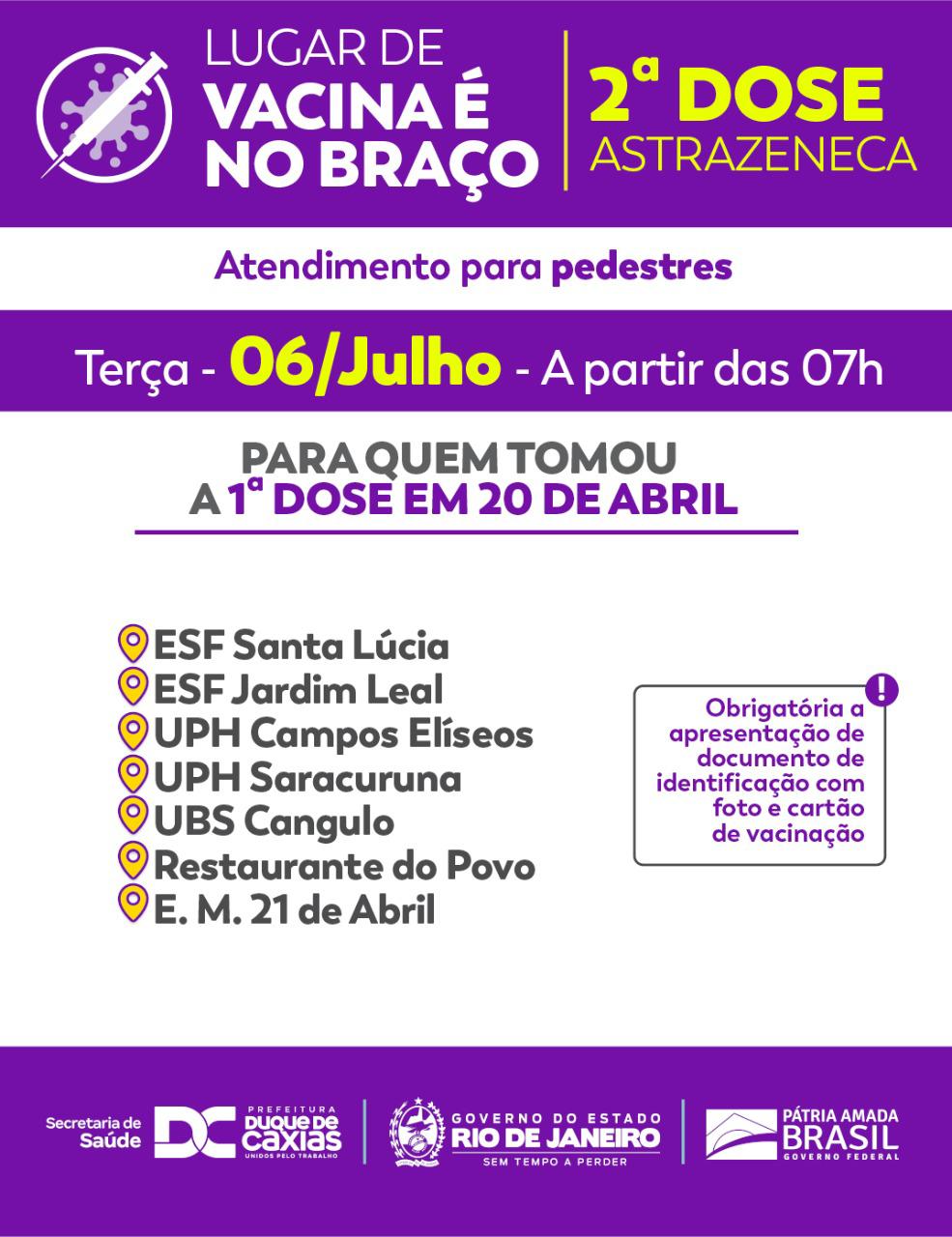 A Prefeitura de Duque de Caxias, através da Secretaria Municipal de Saúde, divulga os grupos a serem vacinados com a segunda dose de Astrazeneca nesta terça (06) e quarta-feira (07). É obrigatória a apresentação de carteira de vacinação e documento de identificação.