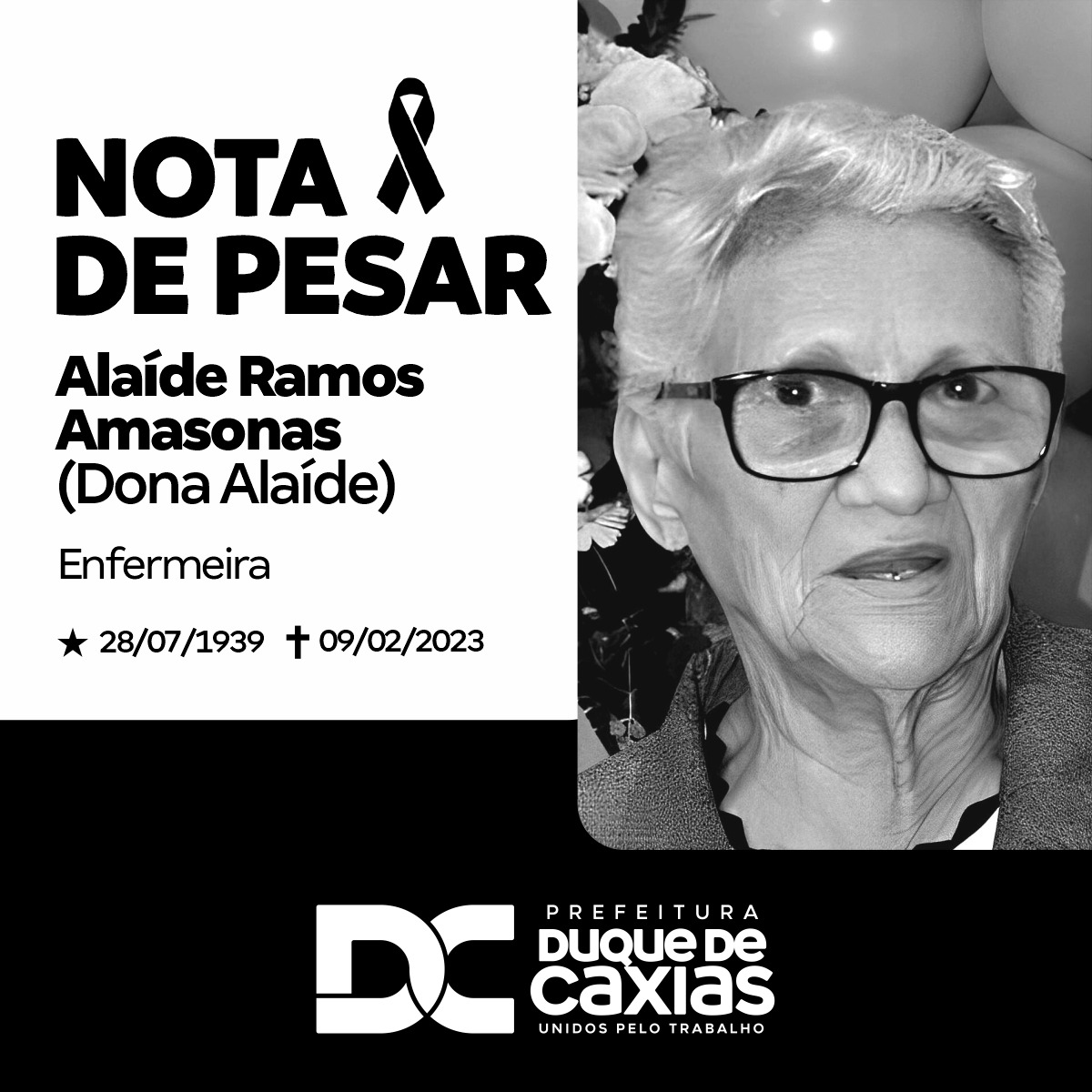 A Prefeitura de Duque de Caxias, em nome do prefeito Wilson Reis, lamenta profundamente o falecimento de Alaíde Ramos Amasonas, ocorrido na última quinta-feira (09/02), aos 83 anos. "Dona Alaíde", como era carinhosamente chamada por amigos e colegas de trabalho, ocupava o cargo de coordenadora de Imunobiológicos da Central de Imunização da Secretaria Municipal de Saúde, além de atuar como missionária da Igreja Assembleia de Deus Montes das Oliveiras.