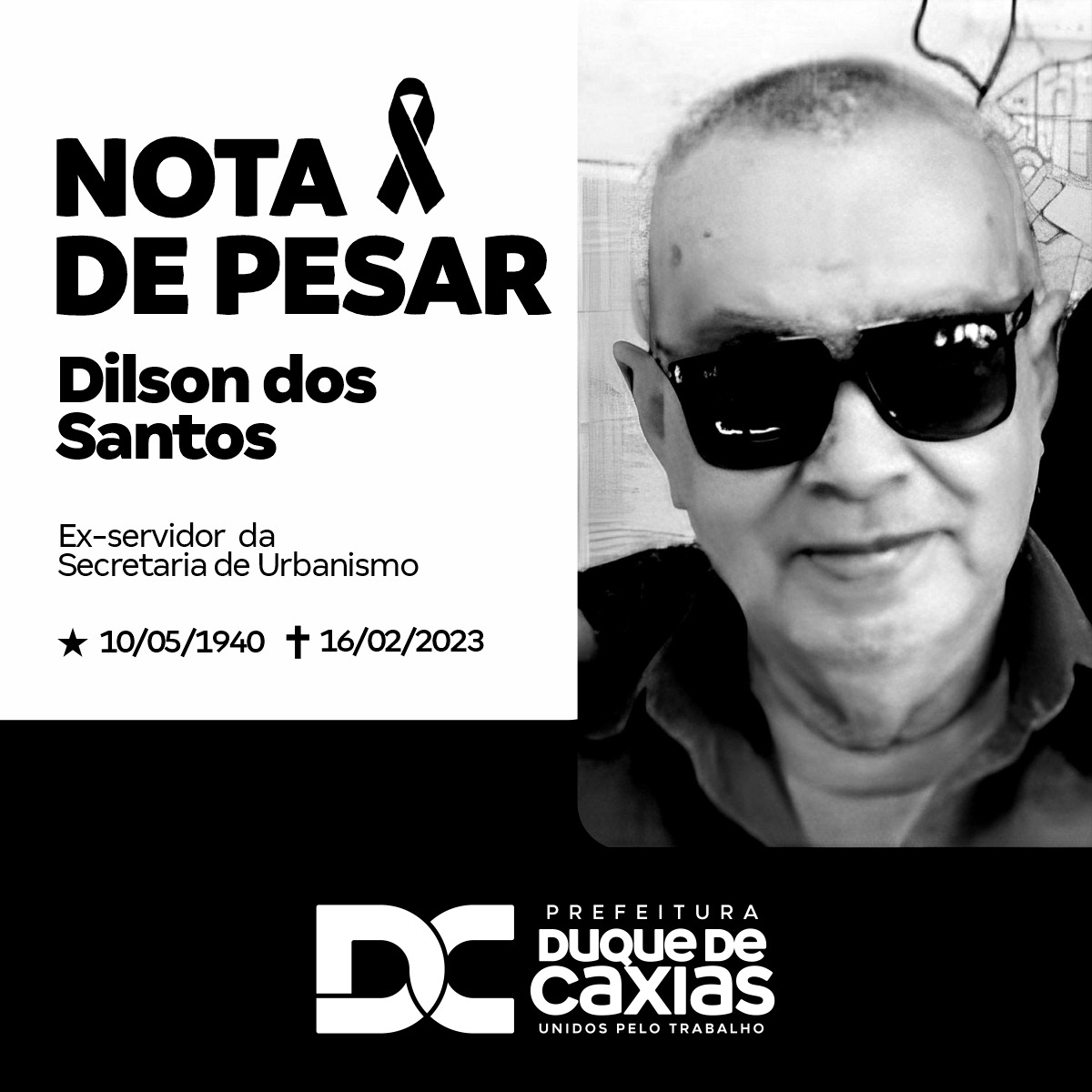 A prefeitura de Duque de Caxias, em nome do prefeito Wilson Reis, se compadece na dor da família do servidor público Dilson dos Santos pela irreparável perda, nesta quinta-feira (16), e presta condolências aos familiares e amigos enlutados. Santos trabalhava há décadas na Secretaria Municipal de Urbanismo e era um funcionário respeitado por todos. Rogamos a Deus que possa confortá-los nesse momento de grande dor, em que palavras se apequenam e o espírito busca amparo na fé.