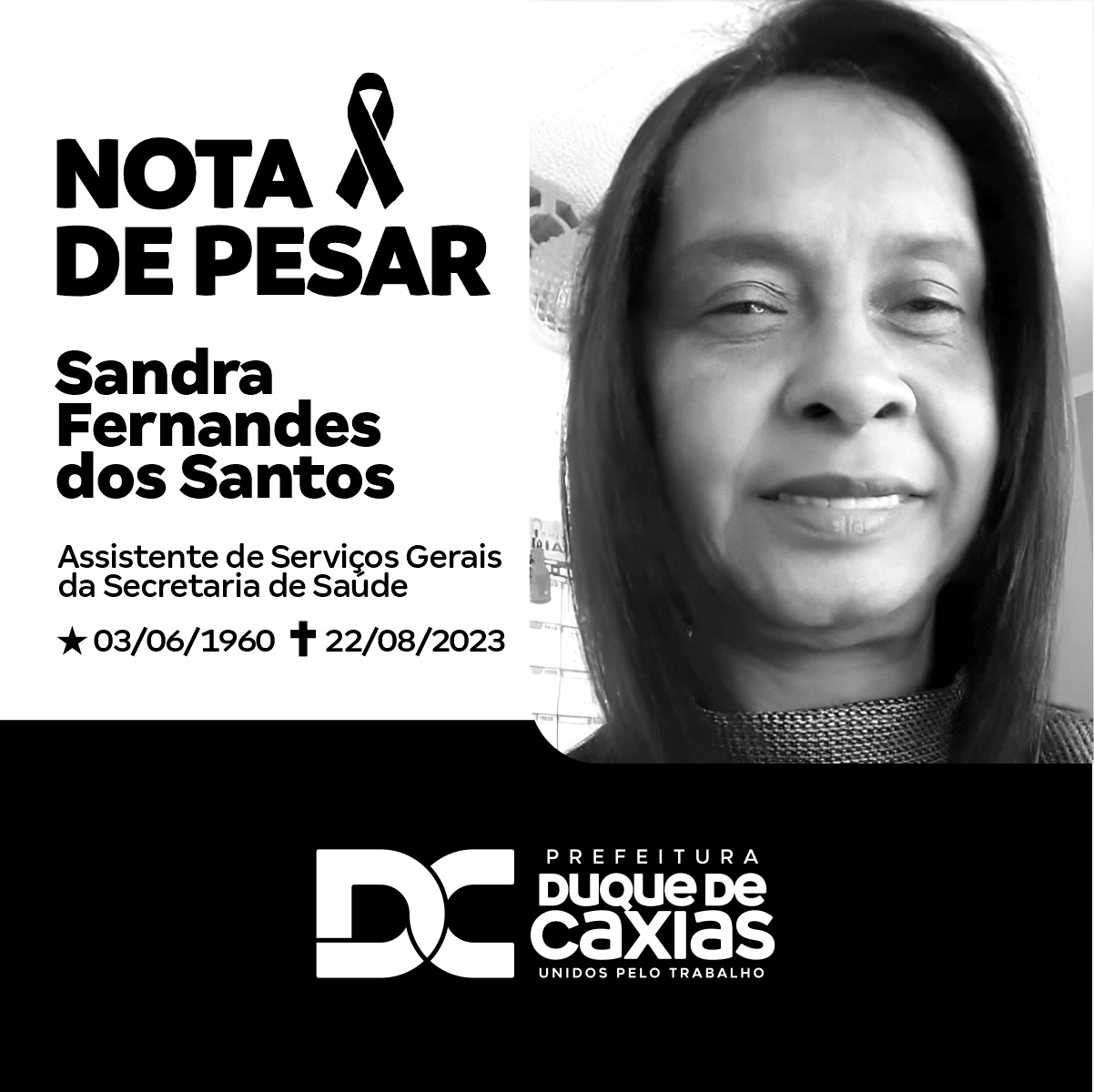 A Prefeitura de Duque de Caxias, em nome do prefeito Wilson Reis, manifesta o mais profundo pesar pelo falecimento, nesta terça-feira (22/08), da funcionária da Secretaria Municipal de Saúde, Sandra Fernandes dos Santos. Nascida em 03/06/1960, Sandra era assistente de Serviços Gerais da SMS, onde era muito querida por todos e deixará muitas saudades. Neste momento de dor, a Administração Municipal se solidariza à família enlutada e aos amigos pela perda irreparável. Que Deus, com sua infinita bondade, conforte todos neste momento de grande tristeza.