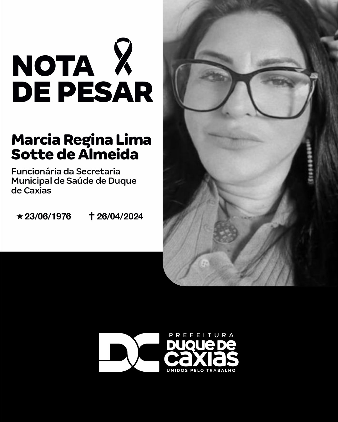 A Prefeitura de Duque de Caxias, em nome do prefeito Wilson Reis, manifesta o mais profundo pesar pelo falecimento da funcionária do setor de Transporte Fora do Domicílio, da Secretaria Municipal de Saúde (SMSDC), senhora Márcia Regina Lima Sotte de Almeida, ocorrido nesta sexta-feira (26/04).