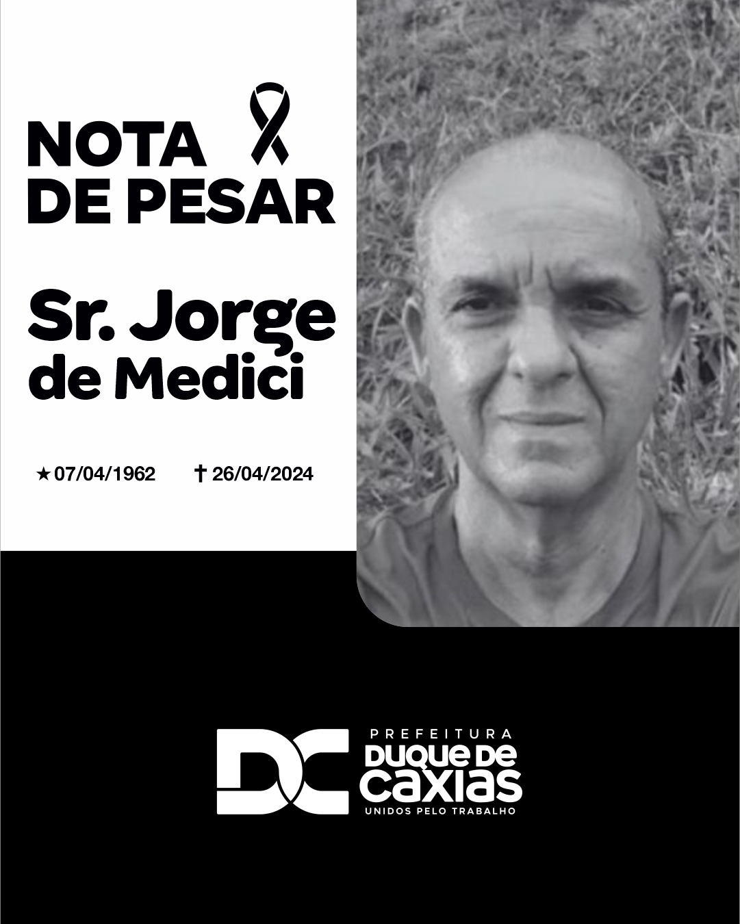 Foi com imenso pesar que a Prefeitura de Duque de Caxias, em nome do prefeito Wilson Reis, recebeu a notícia do falecimento do Sr. Jorge de Medici, pai do Diretor Médico do Hospital Municipal Dr Moacyr Rodrigues do Carmo, Dr Jorge de Medici, nesta sexta-feira (26/04).