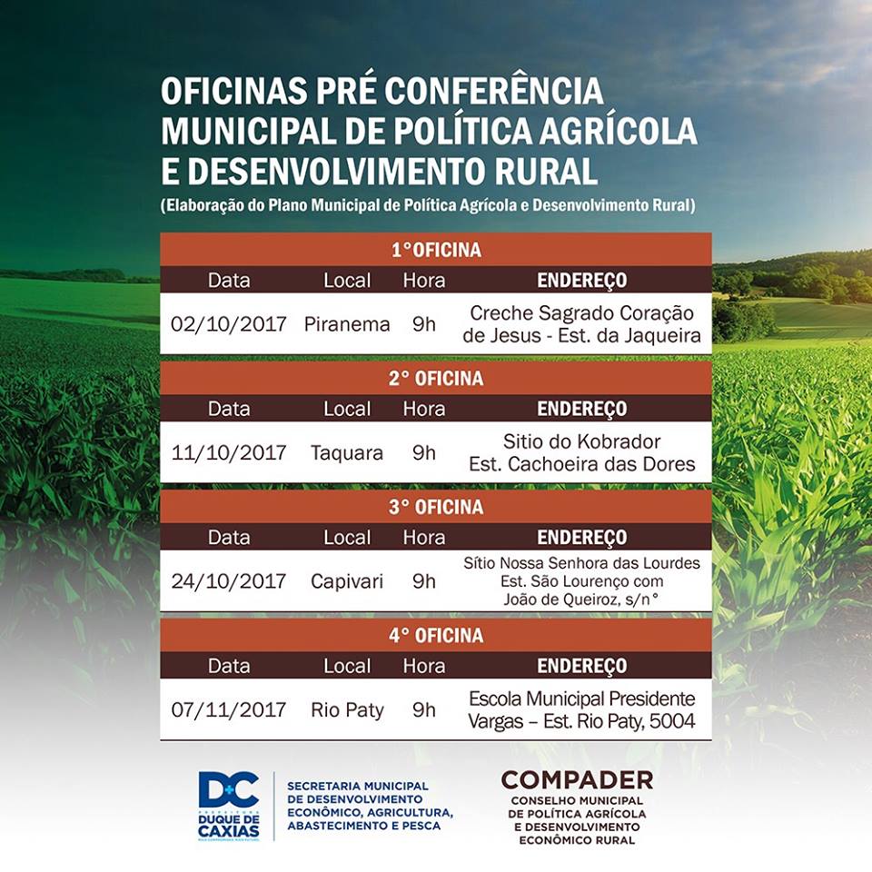 Serão realizadas quatro Oficinas para a discussão de temas voltados para o Desenvolvimento Rural e Políticas Agrícolas. As propostas sugeridas pelos participantes de cada Oficina serão apresentadas na 5ª Conferência Municipal de Política Agrícola e Desenvolvimento Rural de Duque de Caxias, programada para o dezembro, além de fazerem parte do 1º Plano Municipal de Política Agrícola e Desenvolvimento Rural, que está sendo construído de forma participativa e coletiva reunindo membros do Conselho Municipal de Política Agrícola e Desenvolvimento Rural (COMPADER), produtores rurais, técnicos da Secretaria de Desenvolvimento, Abastecimento, Agricultura e Pesca, assessores do Departamento de Segurança Alimentar e Nutricional Sustentável (DESANS) e representantes da EMATER-Rio.