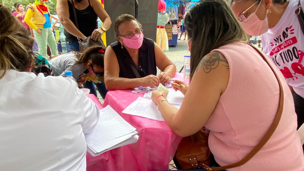 A ginecologista e coordenadora da Saúde da Mulher do Centro Municipal de Saúde (CMSDC), Drª Margareth Nóbrega, foi a responsável em receber as mulheres na tenda da saúde, onde eram disponibilizadas informações quanto ao cuidado e a prevenção ao câncer de mama e de útero, além de fazer agendamentos de consulta e encaminhamentos para realização de exames de preventivo e mamografia.
