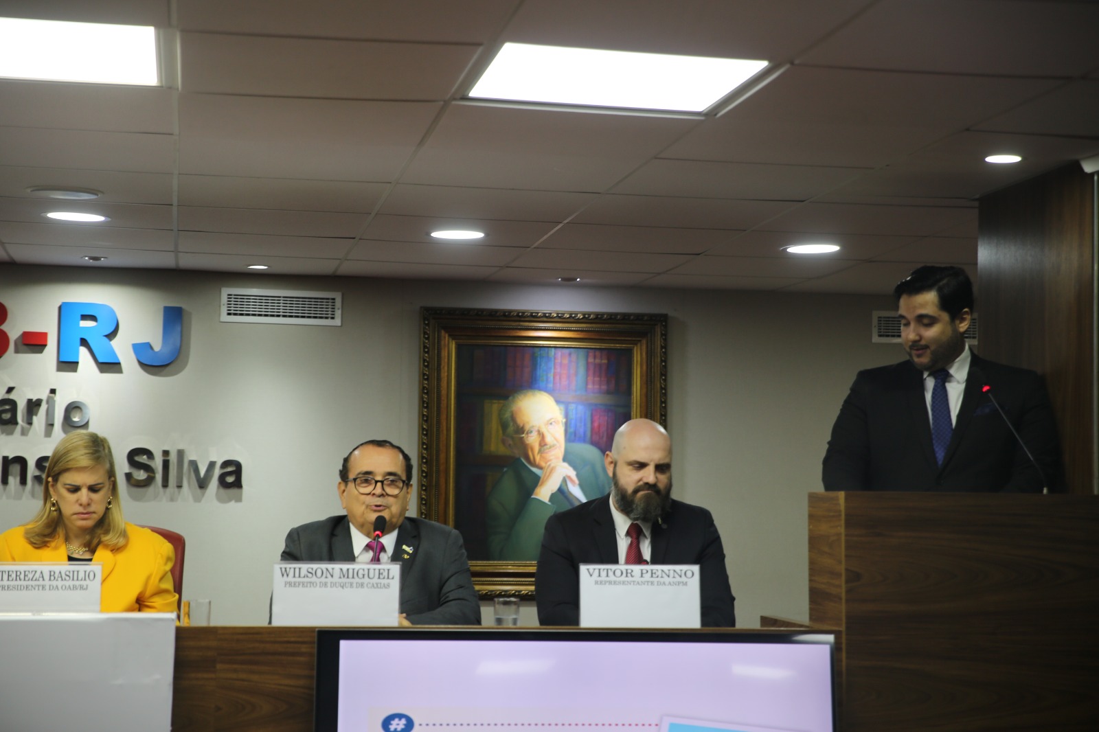 O prefeito de Duque de Caxias, Wi lson Miguel Reis, participou nesta sexta-feira (09/08) da cerimônia de abertura do VI Congresso de Procuradores Municipais do Estado do Rio de Janeiro, realizada na sede da OAB/RJ. O evento contou com a presença de importantes lideranças da advocacia pública, incluindo o presidente da OAB/RJ, Luciano Bandeira, o presidente da Federação dos Procuradores Municipais do Estado do Rio de Janeiro (FEPROMERJ), Igor Faia, além de diversos representantes da advocacia pública municipal.