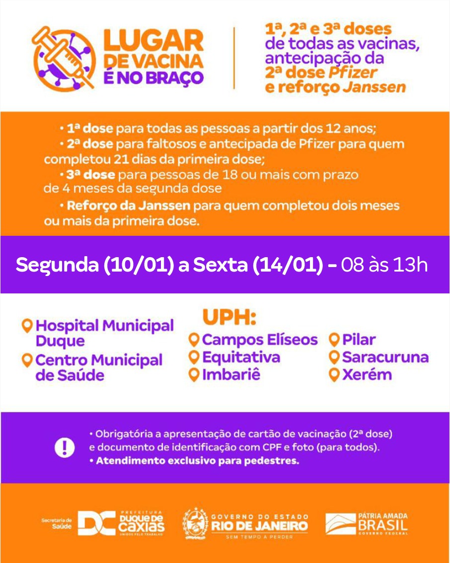 A vacinação acontece das 8h às 13h, nas seguintes unidades: Hospital Municipal Duque - CMSDC - UPH Campos Elíseos - UPH Equitativa - UPH Imbariê - UPH Pilar - UPH Saracuruna - UPH Xerém. A vacinação contra a Covid-19 também acontece nas unidades da rede de Atenção Básica do município (UBS e ESF).