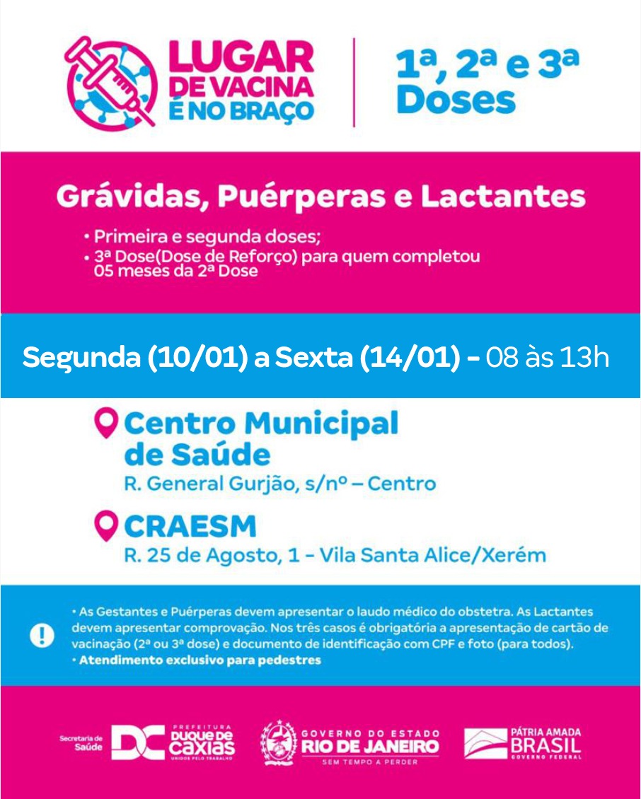 Gestantes, Puérperas e Lactantes - A vacinação com primeira, segunda e terceira (para quem completou 5 meses da segunda dose) para gestantes, puérperas e lactantes, continua no Centro Municipal de Saúde (CMSDC) e no CRAESM de Xerém . As Gestantes e Puérperas devem apresentar o laudo médico do obstetra. As Lactantes devem apresentar comprovação. Nos três casos é obrigatória a apresentação de cartão de vacinação (segunda dose) e documento de identificação com CPF e foto.