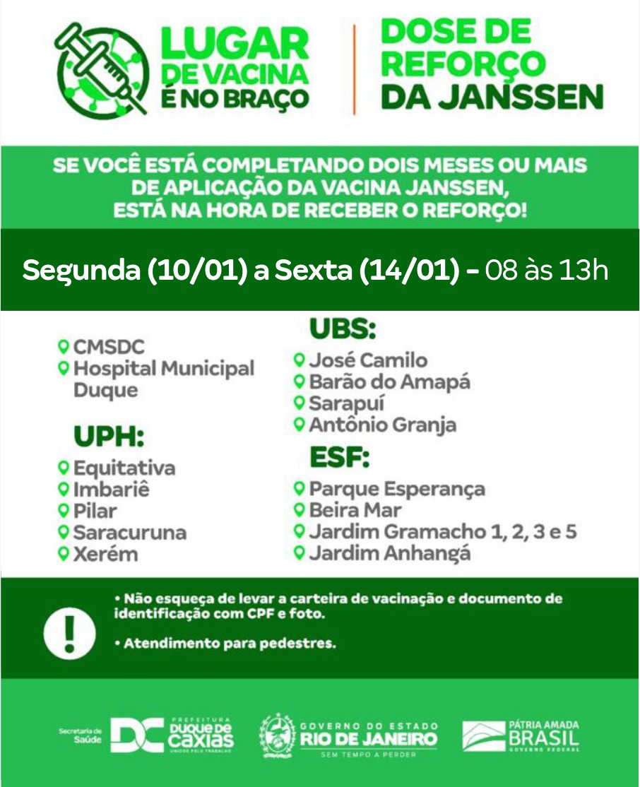 Além dessas unidades, o reforço da vacina Janssen também estará disponível na UBS José Camilo - UBS Barão do Amapá - UBS Sarapuí - UBS Antônio Granja - ESF Parque Esperança - ESF Beira Mar - ESF Jardim Gramacho 1, 2, 3 e 5 - ESF Jardim Anhangá