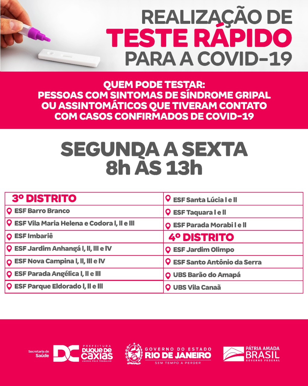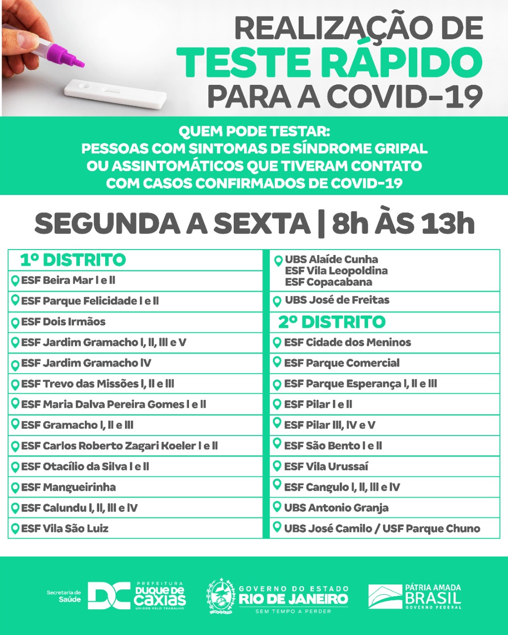 Confira a lista das unidades de Atenção Básica que estão fazendo o teste rápido para a COVID-19 em Duque de Caxias, no decorrer da semana, das 8h às 13h:
