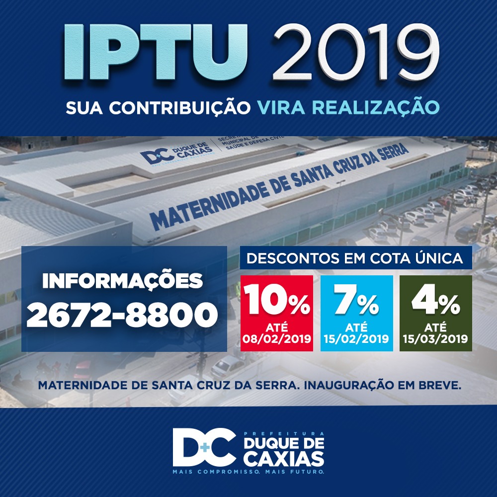 A Prefeitura de Duque de Caxias, através da Secretaria Municipal de Fazenda e Planejamento, está divulgando a tabela de pagamento do IPTU 2019. Até o dia 15 de março, os contribuintes que pagarem o Imposto sobre a Propriedade Predial e Territorial Urbana da cidade de Duque de Caxias, por meio de cota única, poderão usufruir de descontos que variam de 10 a 4%.