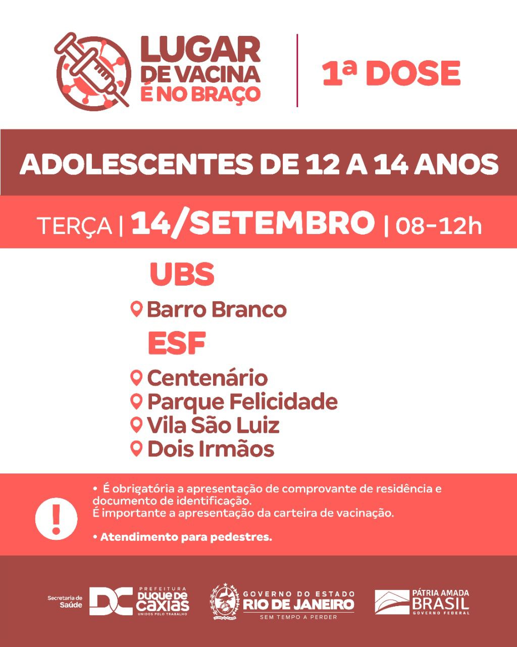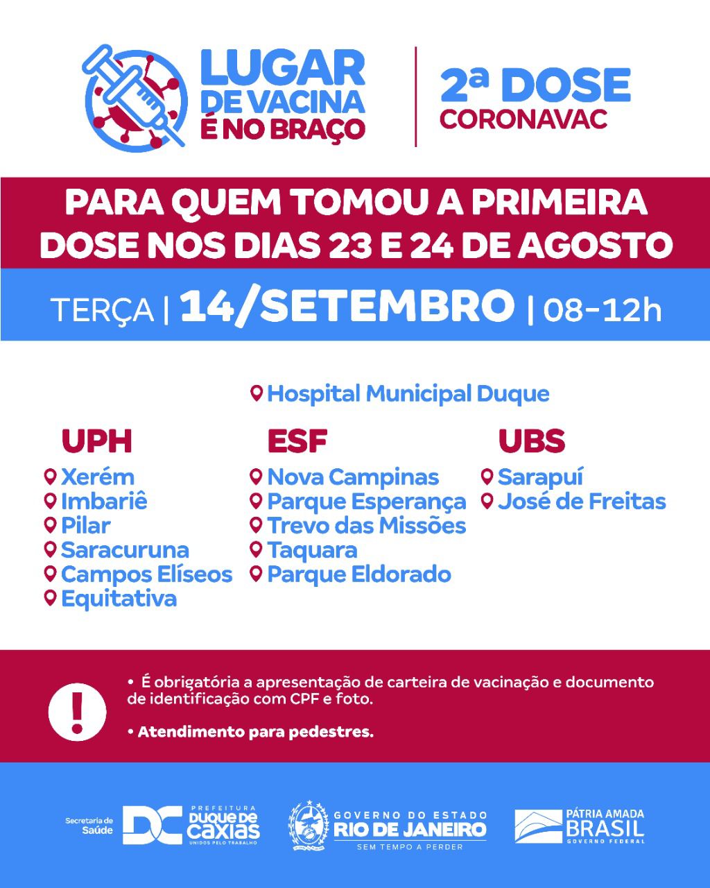 A Prefeitura de Duque de Caxias, através da Secretaria Municipal de Saúde, realiza nesta terça-feira (14/09), vacinação com a segunda dose de Coronavac, para quem recebeu a primeira dose nos dias 23 e 24 de agosto; e segunda dose da Pfizer, para quem foi vacinado nos dias 27, 28 e 29 de junho. O município segue também com a primeira dose para adolescentes com idade de 12 a 14 anos (Com ou sem comorbidades) e para gestantes (acima de 12 anos), puérperas e lactantes.