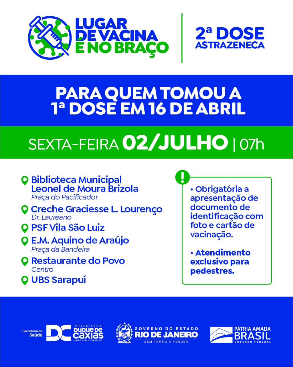 PREFEITURA DE DUQUE DE CAXIAS CONVOCA TODOS OS VACINADOS COM ASTRAZENECA EM 16/04 PARA RECEBEREM A SEGUNDA DOSE NESTA SEXTA (02/07)