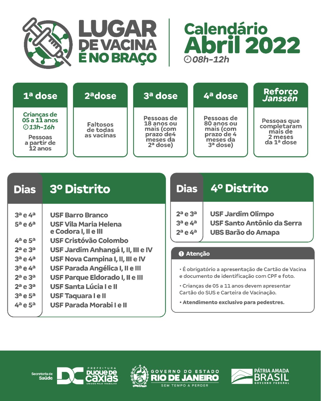 Durante todo o mês de abril, a Prefeitura de Duque de Caxias disponibilizará todas as doses e vacinas contra a covid-19 para crianças (05 a 11 anos), adolescentes (a partir de 12 anos), adultos e idosos (80 anos ou mais).