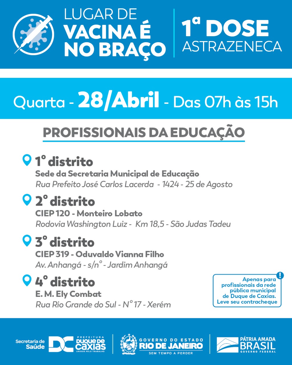 OBS: A Secretaria Municipal de Educação orienta aos professores que procurem o polo de vacinação, de acordo com o distrito em que trabalha.