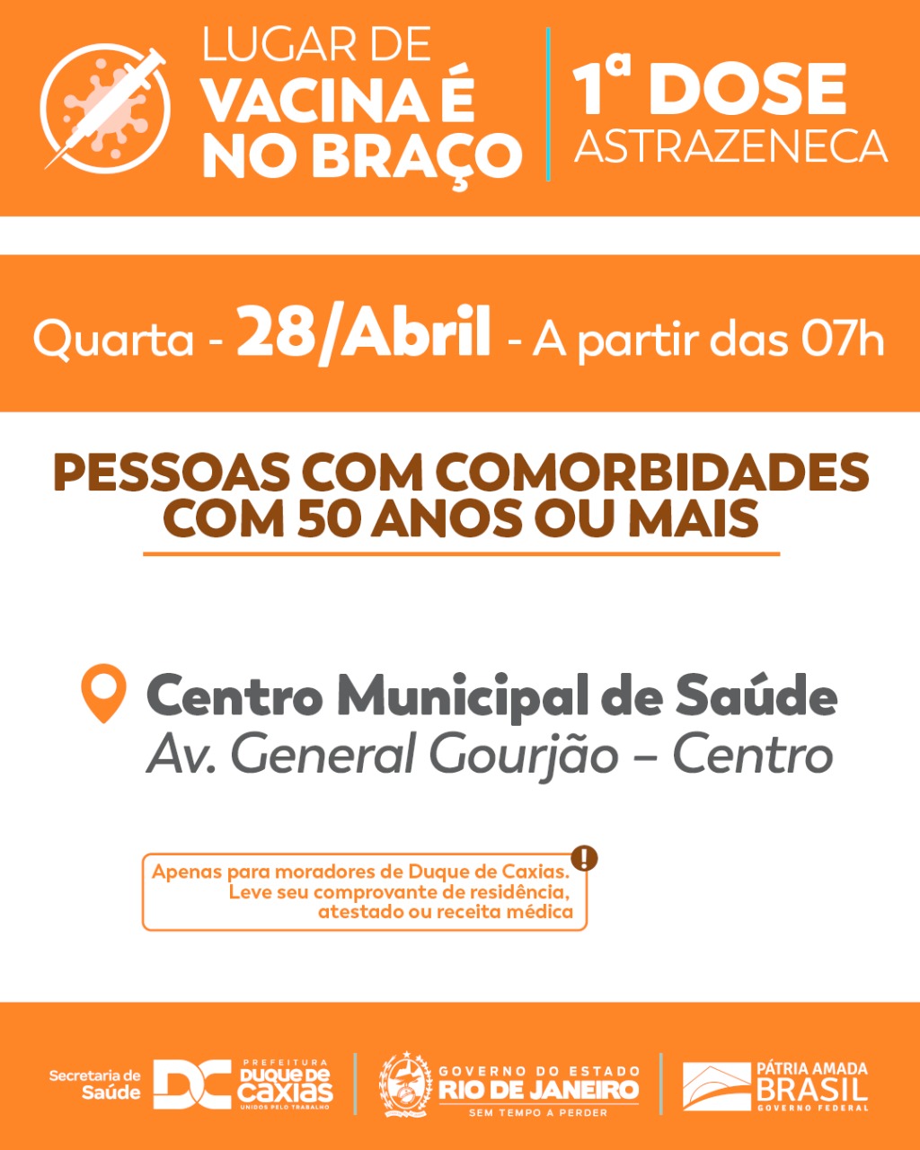 - Pessoas com comorbidades (acima de 50 anos) devem ir ao CMSDC- Centro Municipal de Saúde de Duque de Caxias (Av General Gurjão, Centro)
