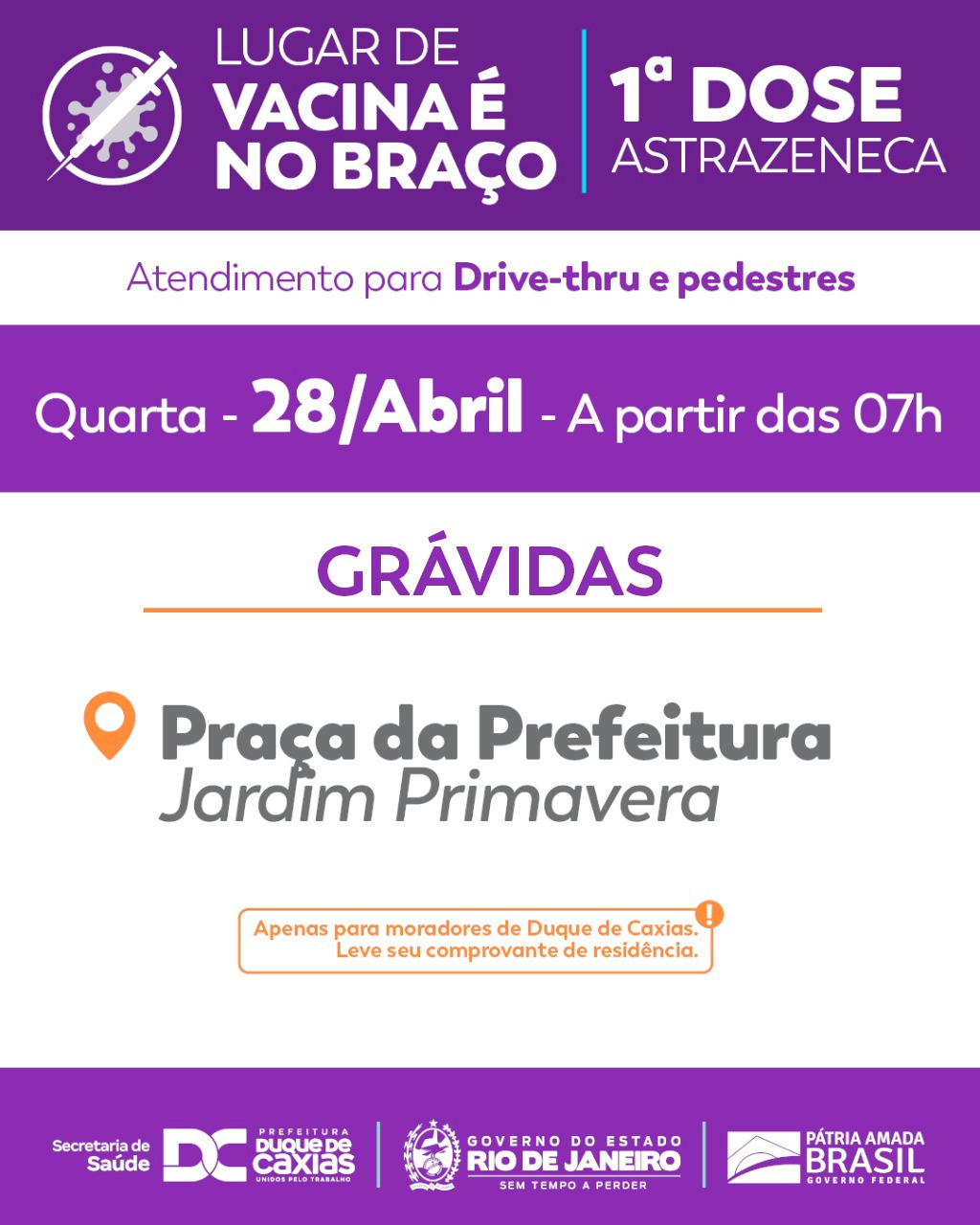 A Prefeitura de Duque de Caxias segue, nesta quarta-feira (28/04), com a vacinação da primeira dose da vacina Oxford/ AstraZeneca para grupo prioritário, incluindo Grávidas, além dos profissionais da Educação da rede pública municipal, Rodoviários e pessoas com comorbidades. Todos foram incluídos no grupo prioritário de vacinação do Plano Nacional de Imunização.