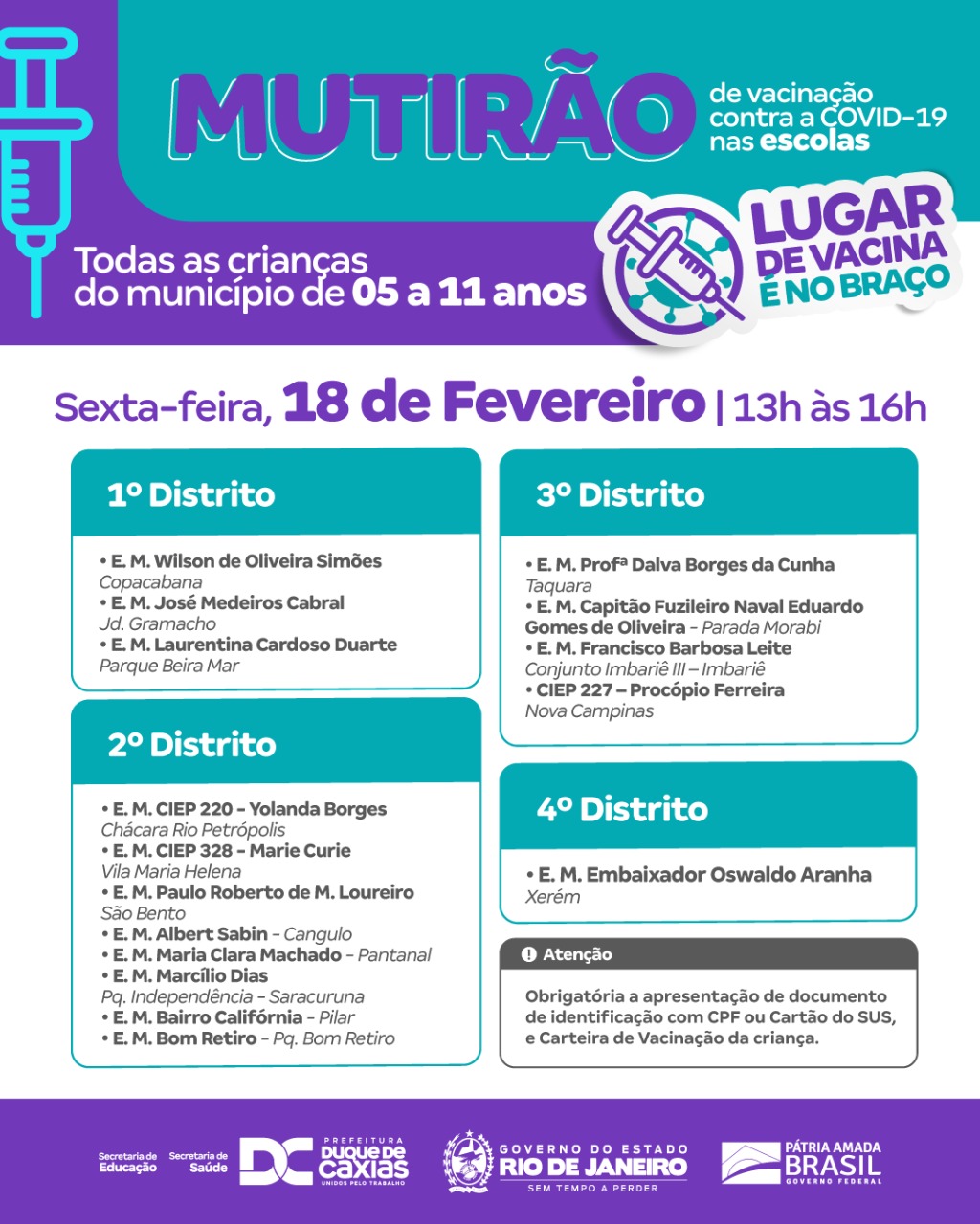 PREFEITURA DE DUQUE DE CAXIAS PROMOVE MUTIRÃO DE VACINAÇÃO INFANTIL NAS ESCOLAS NOS DIAS 18 E 22 DE FEVEREIRO