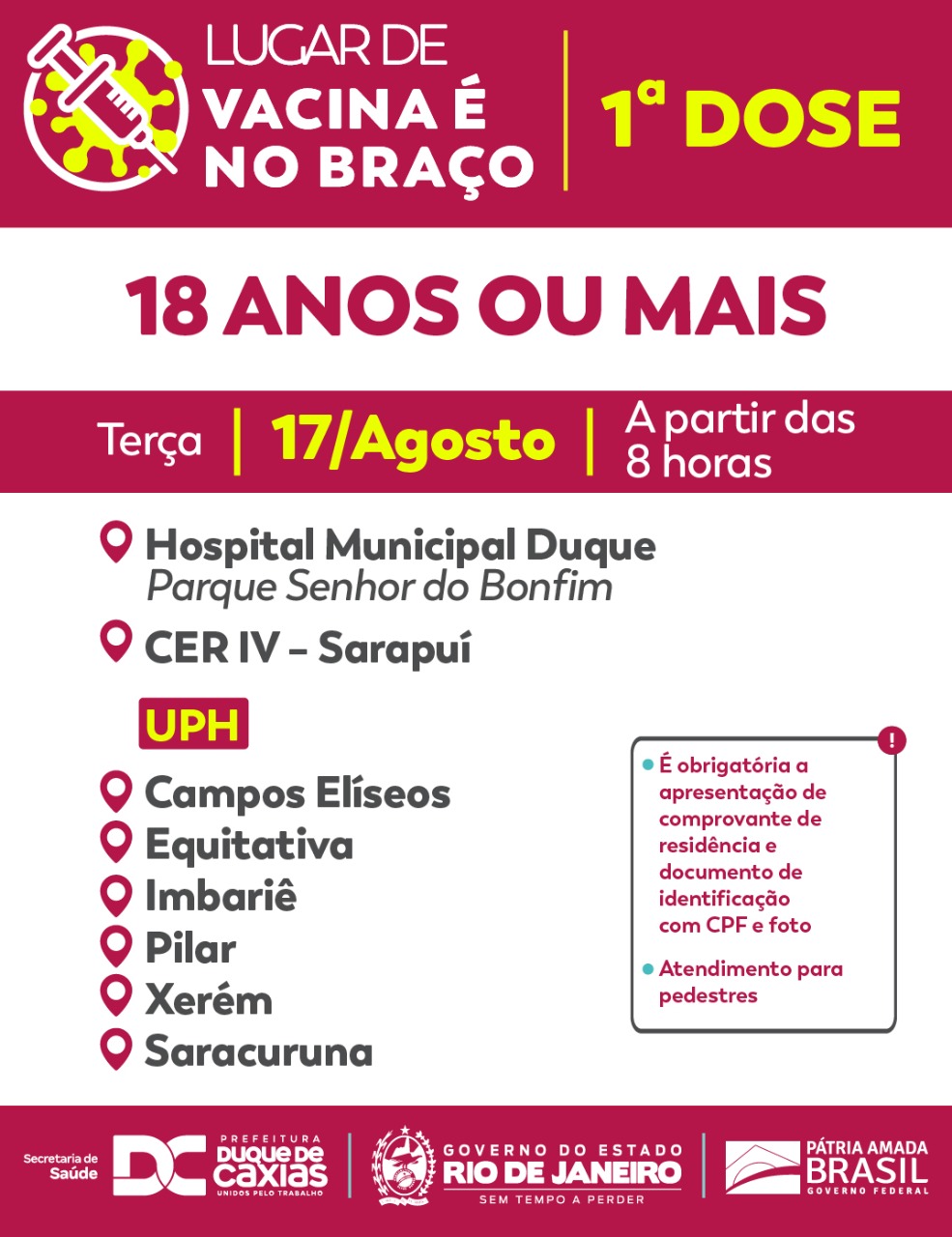 A Prefeitura de Duque de Caxias, através da Secretaria Municipal de Saúde, promove nesta terça-feira (17/08) vacinação com a primeira dose para todos que têm 18 anos ou mais, em quatorze pontos de vacinação no município.