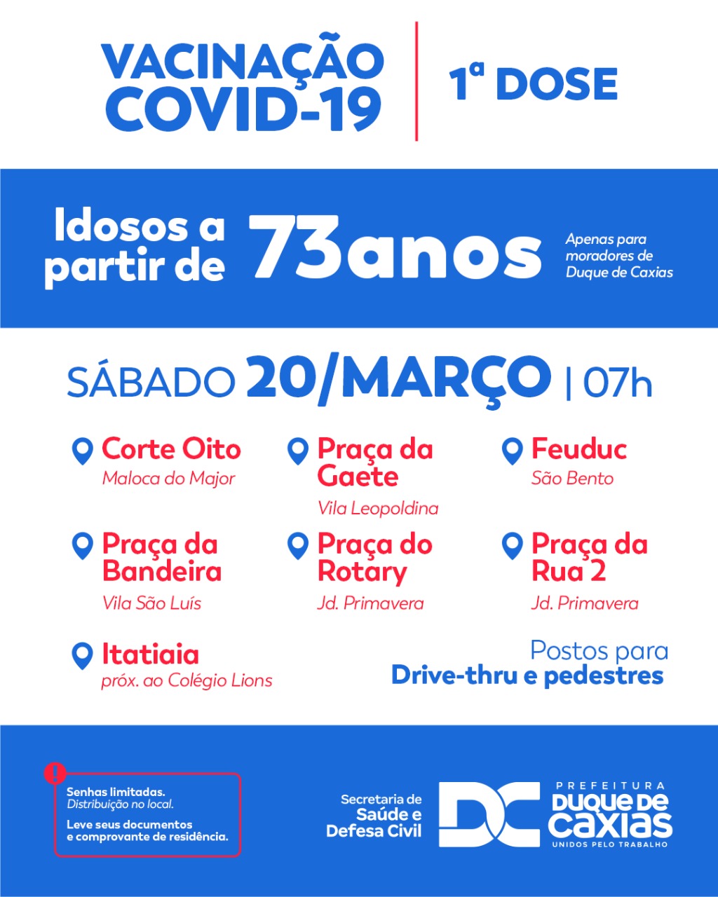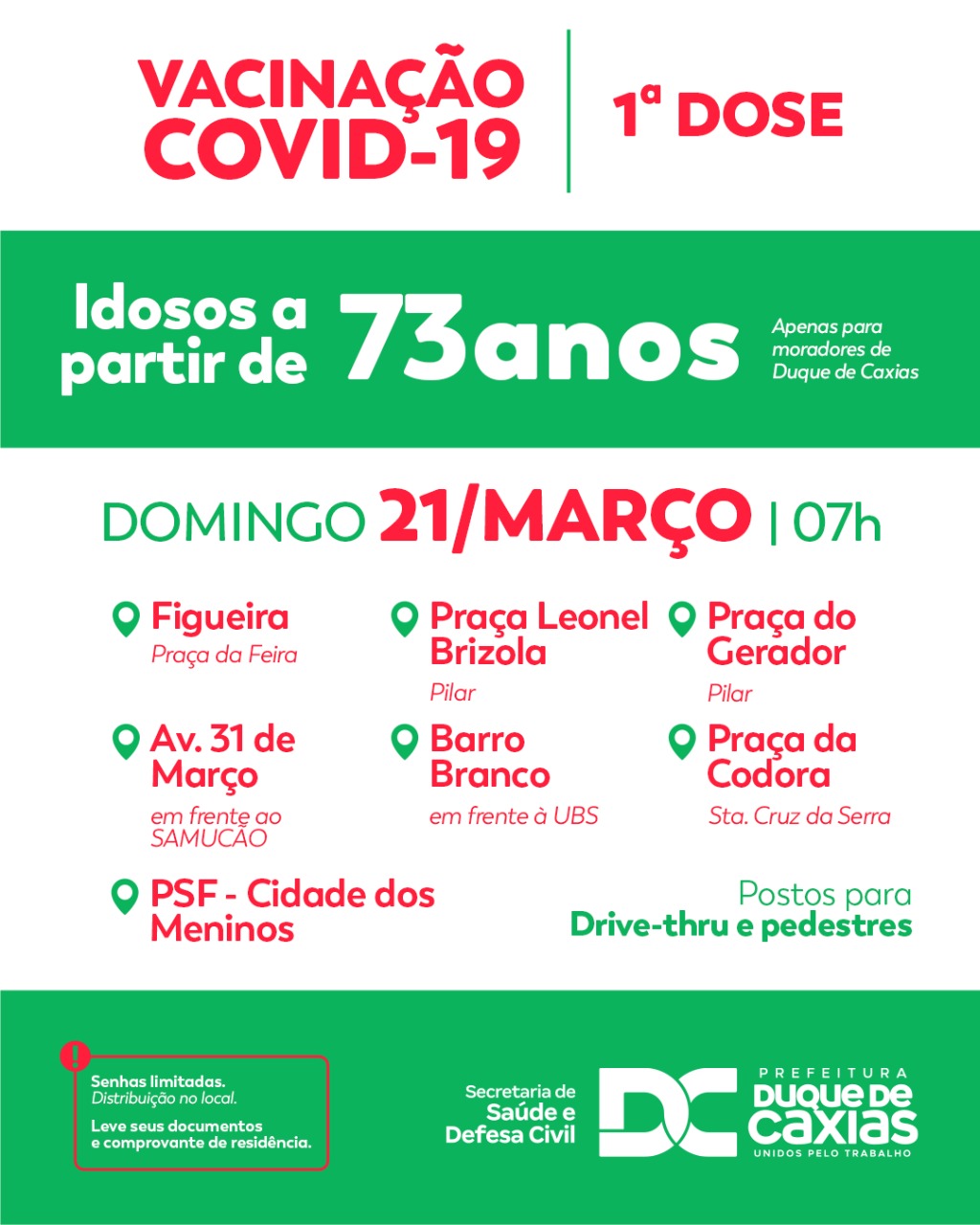 A Prefeitura de Duque de Caxias promove neste fim de semana, nos dias 20 e 21 de março, a partir das 7 horas, aplicação da primeira dose da vacina contra a Covid-19 para pessoas acima de 73 anos ou mais no município. A Prefeitura ressalta que é preciso apresentar comprovante de residência e documento de identidade no ato da vacinação.