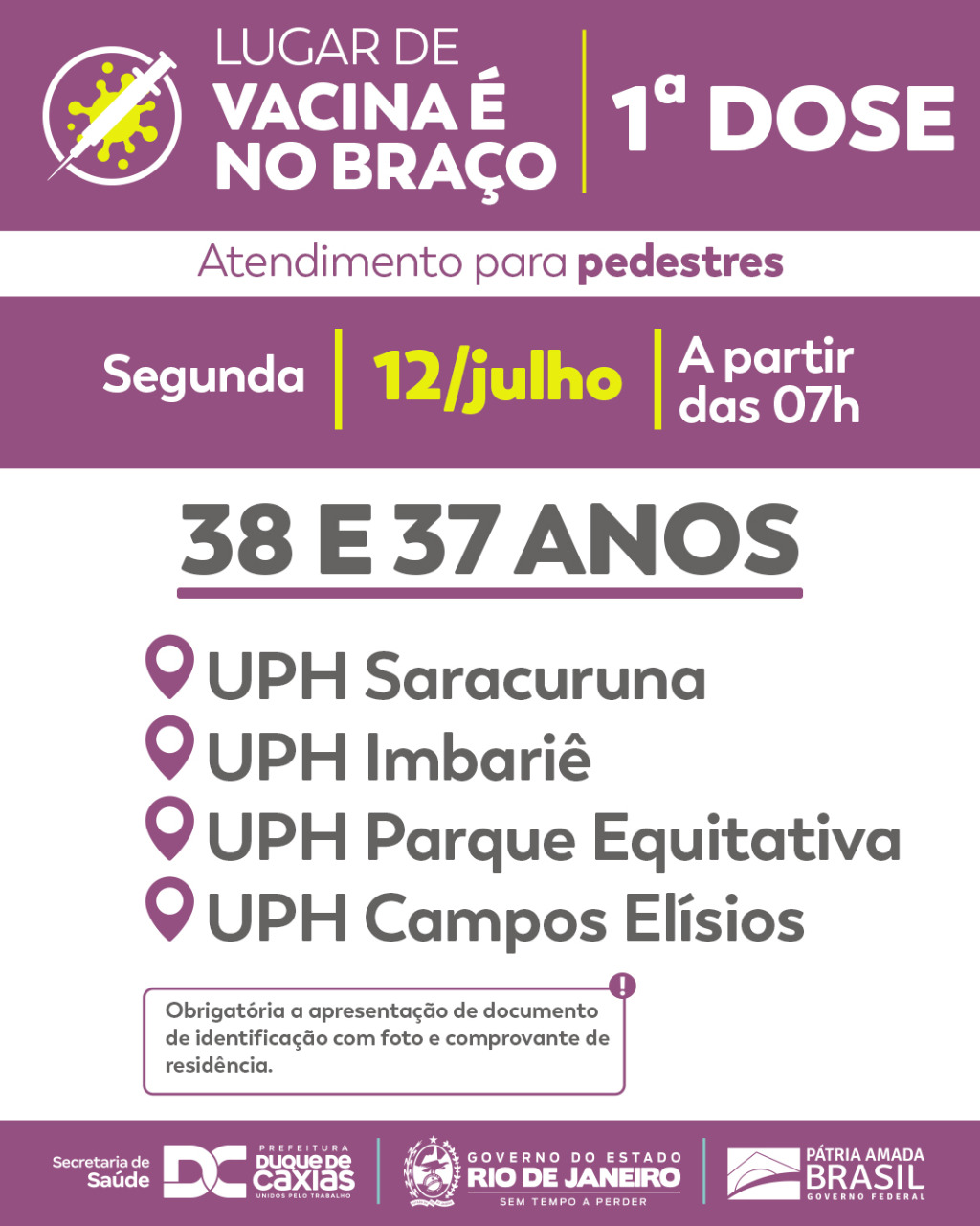 A Prefeitura de Duque de Caxias, Secretaria Municipal de Saúde, realizará nesta segunda-feira, 12/07, vacinação com a primeira dose contra a Covid-19, somente para pessoas com 38 e 37 anos.