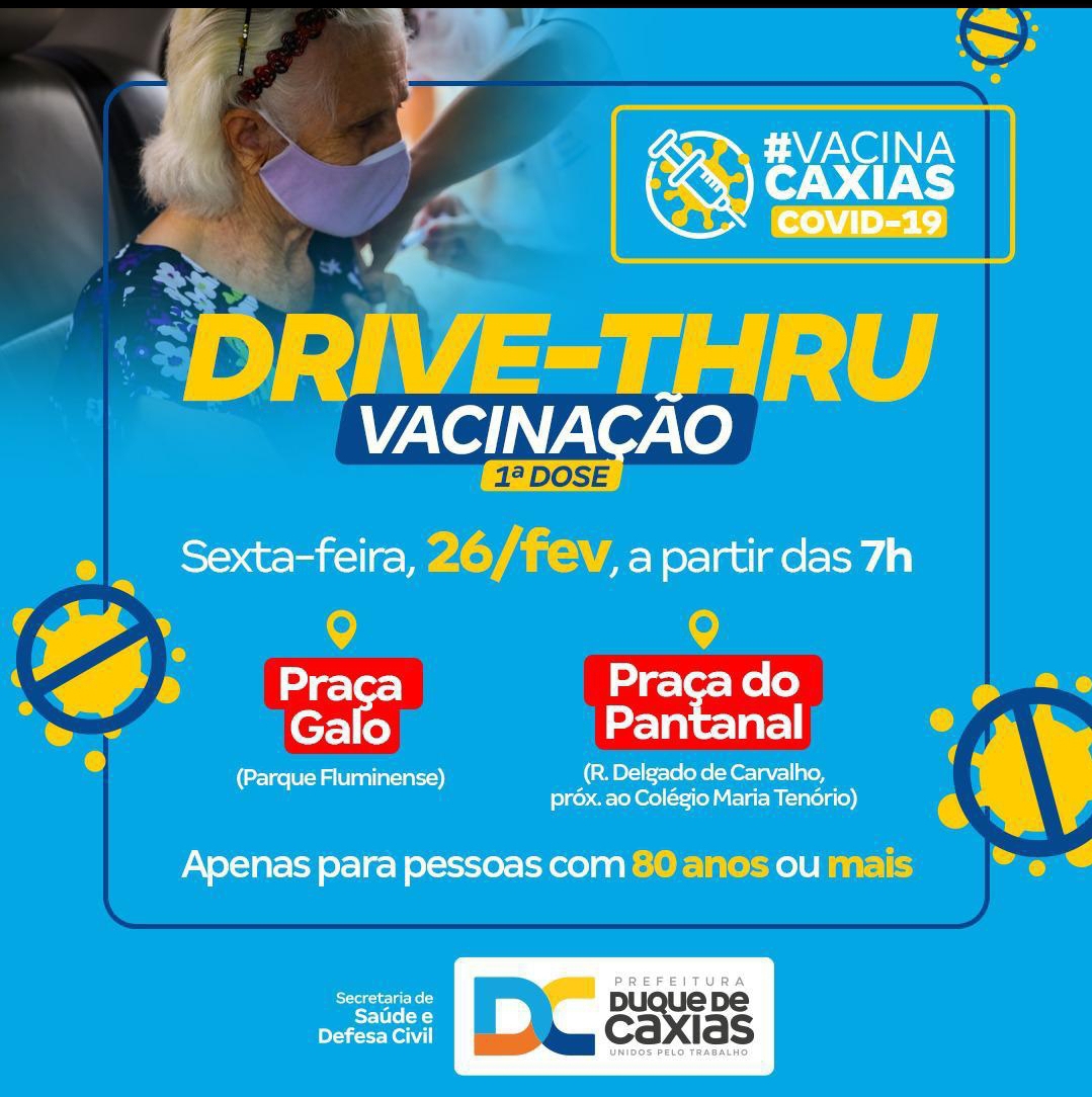 A Prefeitura de Duque de Caxias segue, nesta sexta-feira (26/02), com o cronograma de vacinação para aplicação da primeira dose da vacina contra a Covid-19 aos idosos de 80 anos ou mais. A partir das 7h, eles poderão se dirigir aos dois pontos de vacinação em sistema Drive Thru, instalados na Praça do Galo (Parque Fluminense) e Praça do Pantanal (em frente a Escola Municipal Maria Clara Machado – Antiga Maria Tenório), no segundo distrito.