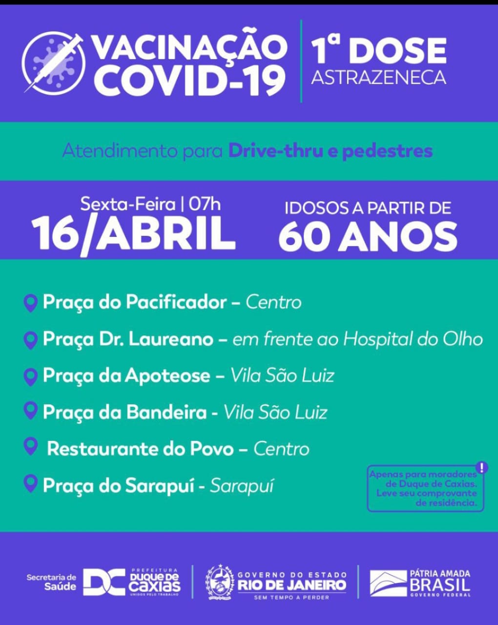 A Prefeitura de Duque de Caxias informa que o município segue nesta sexta-feira (16/04), com a vacinação da primeira dose de Astrazeneca para 60 anos ou mais, nos seguintes locais, a partir das 7 horas.