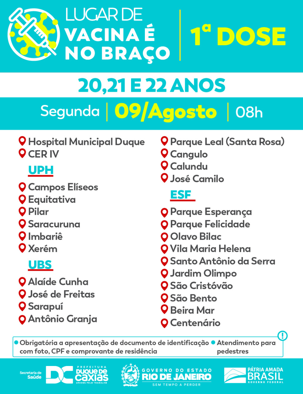 A Prefeitura de Duque de Caxias, através da Secretaria Municipal de Saúde, promove nesta segunda-feira (09/08) vacinação com a primeira dose para quem tem entre 20 e 22 anos.