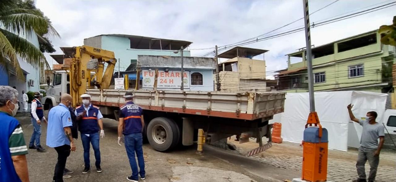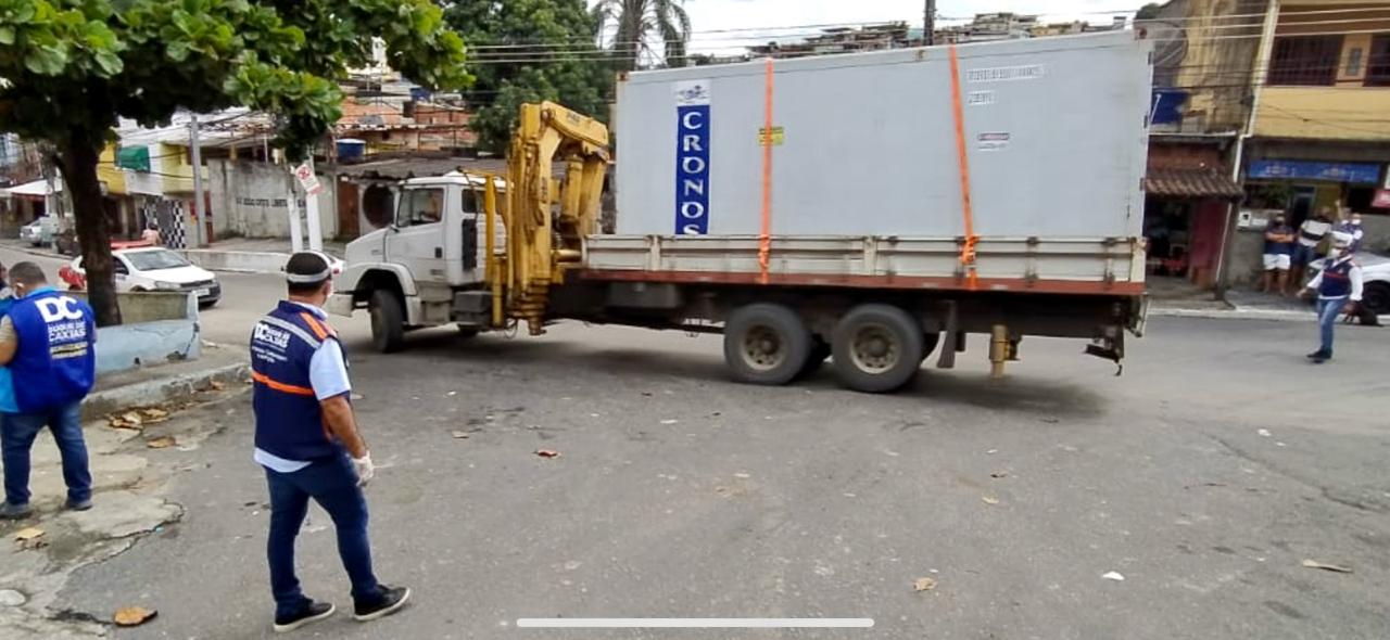A Prefeitura de Duque de Caxias retirou nesta sexta-feira, 8, o contêiner frigorífico que estava instalado no Cemitério Tanque do Anil, no bairro Beira-Mar. A ação foi realizada pela Secretaria de Obras e contou com a participação de agentes das secretarias de Saúde e Defesa Civil, Transportes e Serviços Públicos, Urbanismo e Habitação, e Segurança. O contêiner estava no local desde o mês passado sem as devidas licenças da administração municipal. De acordo com denúncias recebidas, o frigorífico estava armazenando corpos, principalmente, das famílias mais humildes até que essas pudessem pagar para realizar o enterro de seus entes queridos.