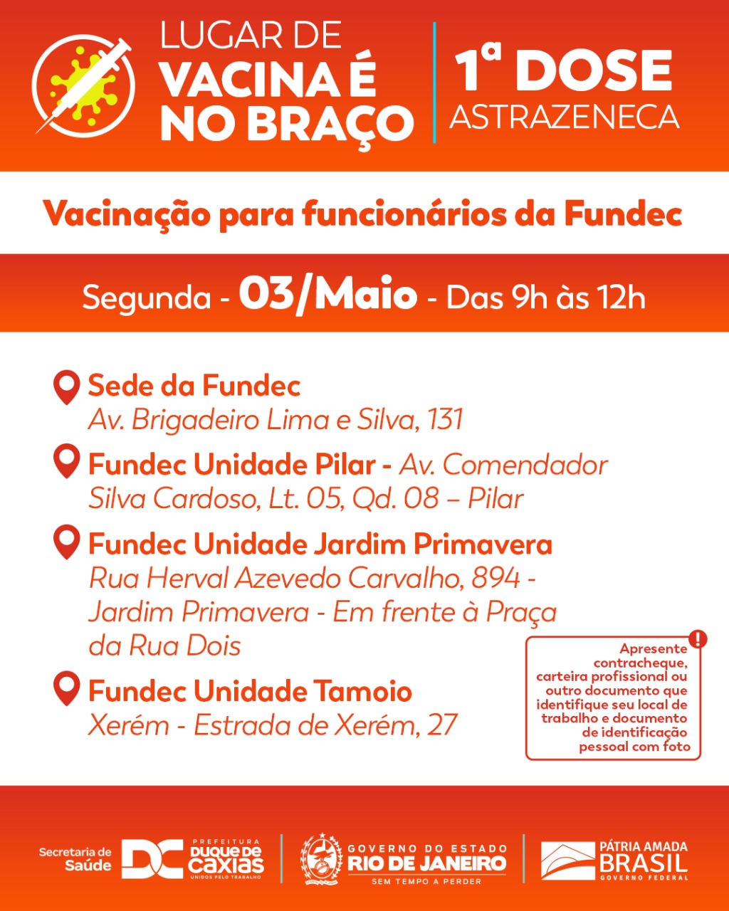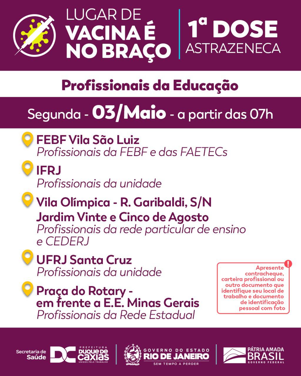 A Prefeitura de Duque de Caxias segue com a vacinação contra a Covid-19 no município, nesta segunda-feira, 03/05. Estão sendo disponibilizados pontos de vacinação para aplicação da primeira dose da vacina Astrazeneca, para pessoas com comorbidades (a partir de 50 anos), profissionais de educação da rede estadual, privada e de instituições de ensino instaladas no município de Duque de Caxias. Todos os grupos estão incluídos como prioritários pelo Plano Nacional de Imunização (PNI):