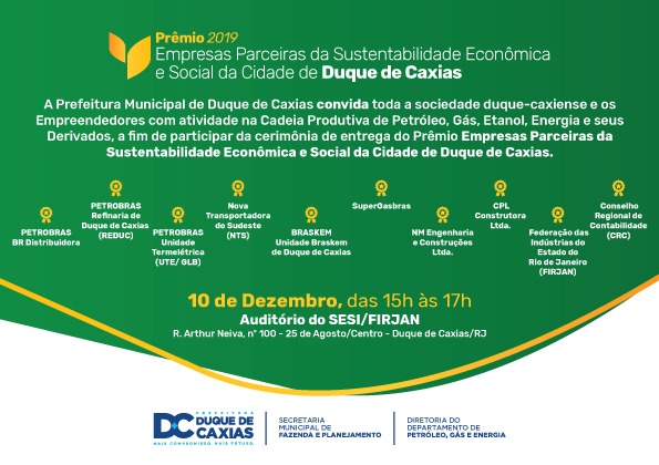 A Prefeitura de Duque de Caxias, através da Secretaria Municipal de Fazenda e Planejamento (SMFP), promove no dia 10/12, das 15h às 17h, no auditório do Sesi/Firjan (Rua Arthur Neiva, nº 100 - Bairro 25 de Agosto), a cerimônia de entrega do prêmio “Empresas Parceiras da Sustentabilidade Econômica e Social da Cidade de Duque de Caxias”.