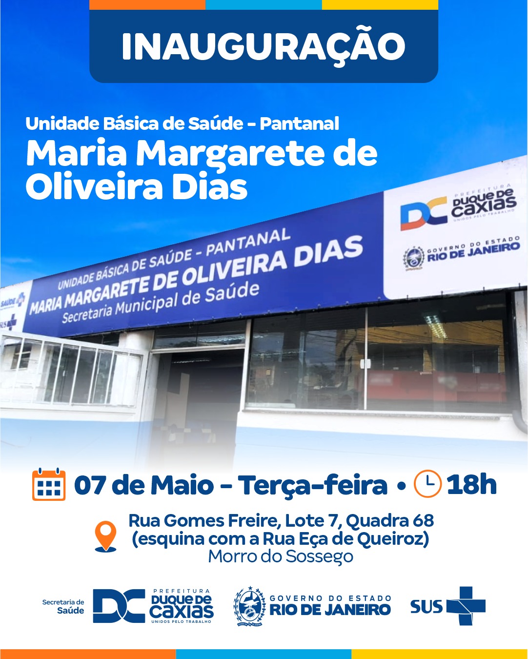 Nesta terça-feira (07), às 18h, no bairro Pantanal, o prefeito Wilson Reis e a secretária municipal de Saúde, dra Célia Serrano entregam a unidade UBS Maria Margarete de Oliveira Dias, localizada na Rua Gomes Freire, Lote 7, quadra 68, (esquina com a Rua Eça de Queiroz), no Morro do Sossego.