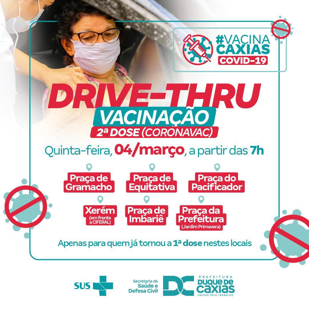 A Prefeitura de Duque de Caxias dará início, nesta quinta-feira (04/03), à aplicação da segunda dose da vacina Coronavac para os idosos de 80 anos ou mais, completando a imunização contra a Covid-19 para este grupo etário. O mutirão acontecerá a partir das 7 horas, em seis postos de vacinação Drive Thru, montados nos seguintes locais: Xerém (em frente a Marcopolo/Ciferal), Praça da Prefeitura (Jardim Primavera), Praça de Imbariê, Praça do Gramacho, Praça do Parque Equitativa e Praça do Pacificador (Centro).