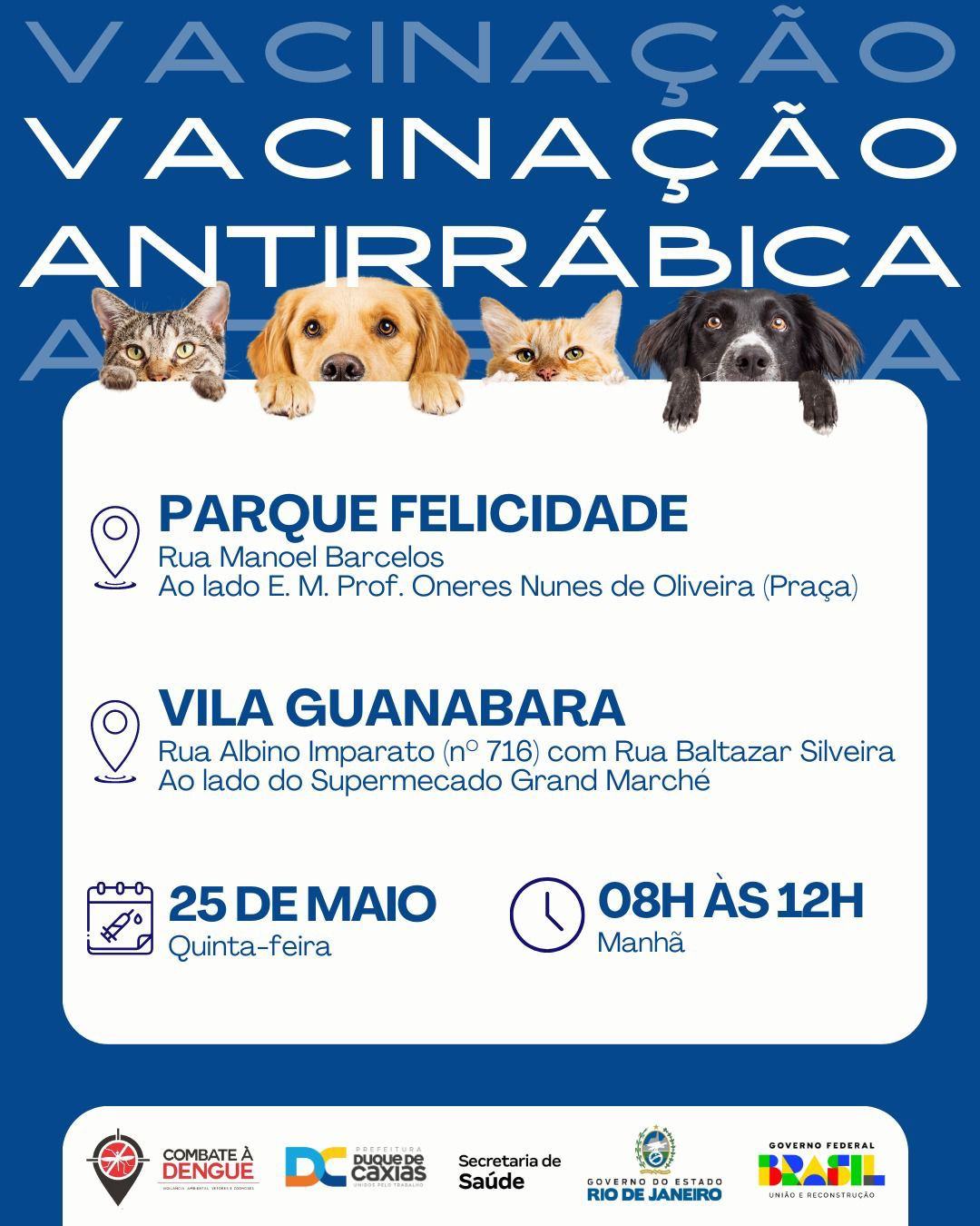 A Prefeitura de Duque de Caxias, através da Superintendência de Vigilância Ambiental, Vetores e Zoonoses (SVAVZ) da Secretaria Municipal de Saúde, segue com as ações de combate à Dengue, Zika e Chikungunya e com a campanha de vacinação contra a raiva animal no município.