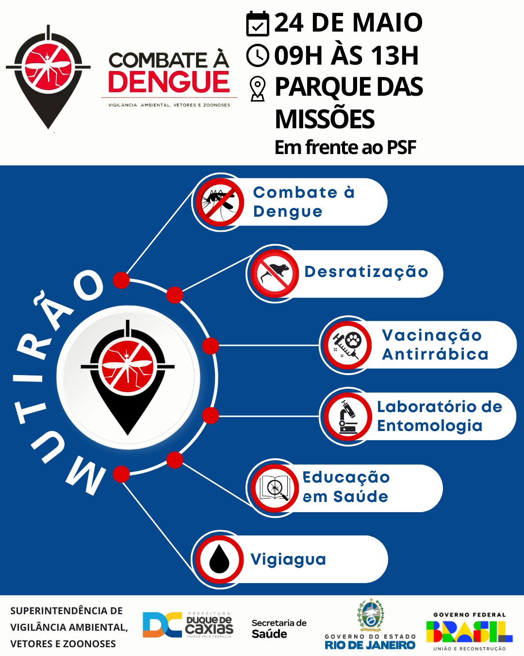 Nos dias 24 e 25/05 também serão realizados mutirões de Combate à Dengue, Zika e Chikungunya. A ação contará com carros fumacê, equipe de difícil acesso (telas de Caixa d’água), equipe de pontos estratégicos (Borracheiros, Galpões e Ferros Velhos), equipe de desratização, Vigiagua, além de atividades educativas de prevenção e combate ao mosquito Aedes aegypti.