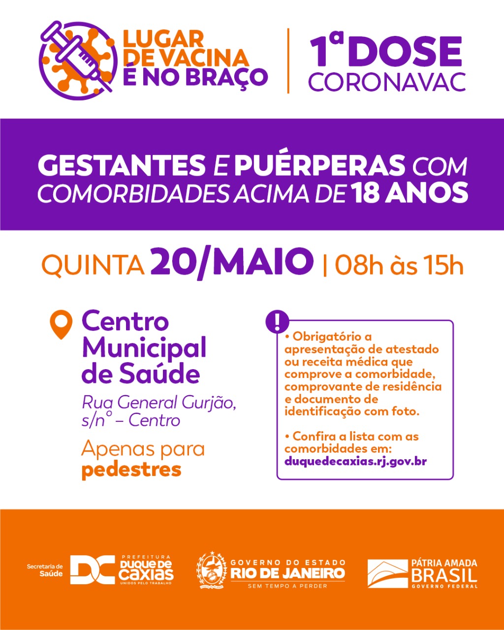 A Prefeitura de Duque de Caxias segue com a aplicação da segunda dose de Coronavac, nesta quinta-feira (20/05). A vacinação, que acontece na Praça da Prefeitura (Jardim Primavera) e CMSDC-Centro Municipal de Saúde ( Centro), é aberta a todos que perderam as convocações anteriores.