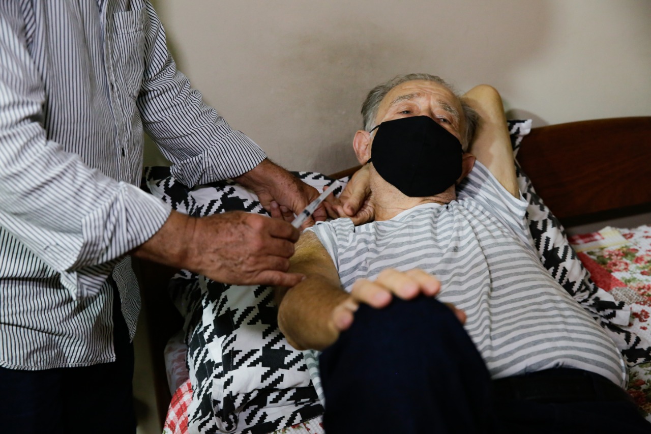Logo em seguida, o secretário de Saúde foi à casa do senhor Antônio Joaquim Coelho da Cunha, de 80 anos, para aplicar a dose da vacina no idoso acamado. “Estou emocionado e espero que esta dose me traga todas as esperanças desejadas para o sucesso da cirurgia que vou passar no próximo dia 11, quinta-feira. Quero a proteção de Deus para eu poder viver mais e com saúde,” contou o senhor Antônio.
