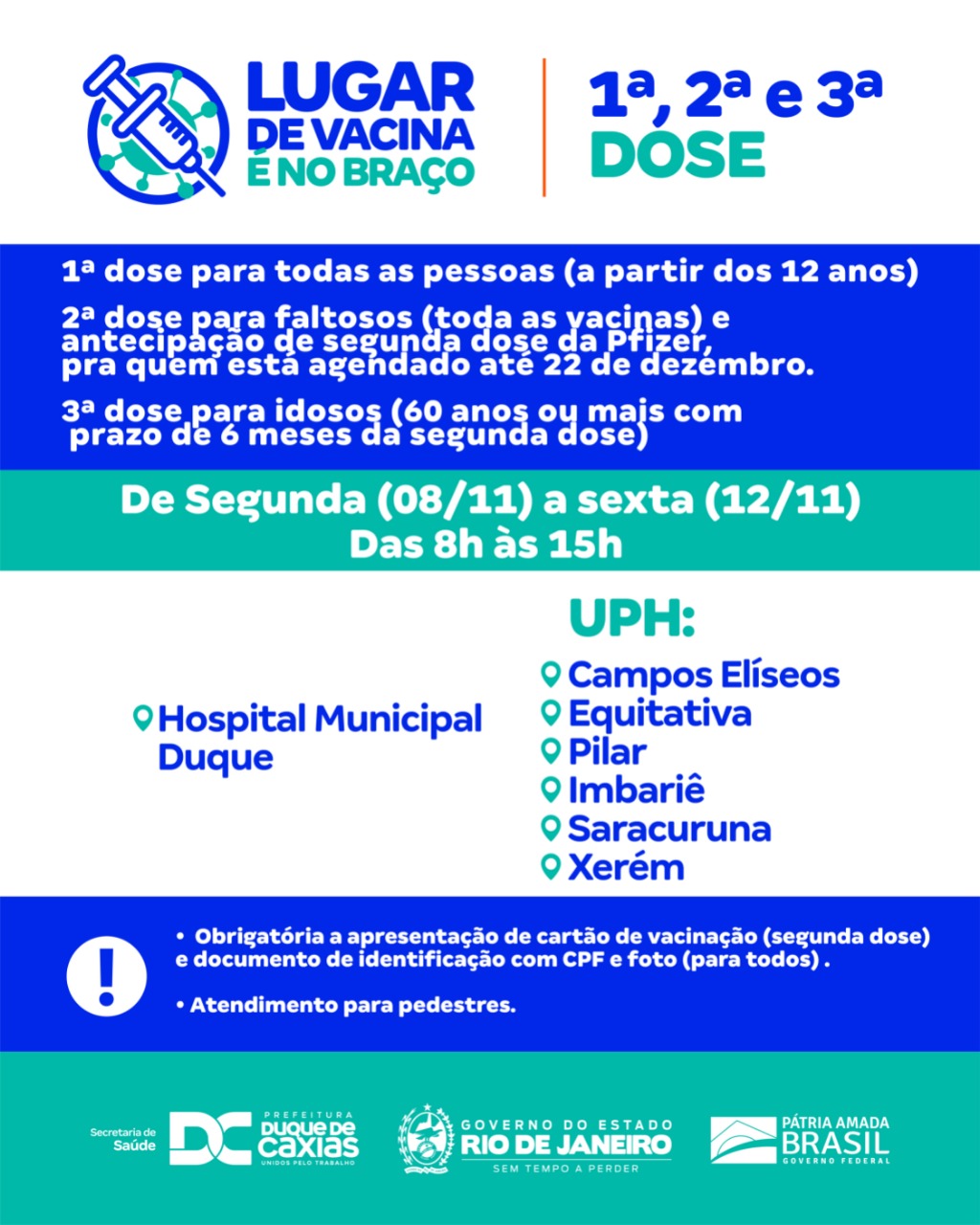 Nesta quarta-feira (10/11), a Prefeitura de Duque de Caxias, através da Secretaria Municipal de Saúde, fará vacinação com a segunda dose de Pfizer antecipada, para aqueles que estão agendados até 22 de dezembro. A vacinação segue em todo o município com a primeira dose (para pessoas acima de 12 anos), segunda dose (para os faltosos de todas as vacinas) e terceira dose para idosos (60 anos ou mais com prazo de 6 meses da segunda dose).