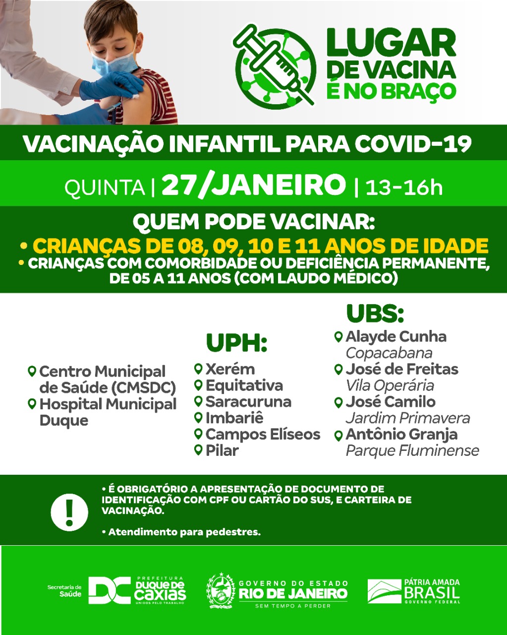 QUINTA-FEIRA (27) DE VACINAÇÃO PARA CRIANÇAS, ADOLESCENTES, ADULTOS E TESTE RÁPIDO PARA A COVID-19 EM DUQUE DE CAXIAS