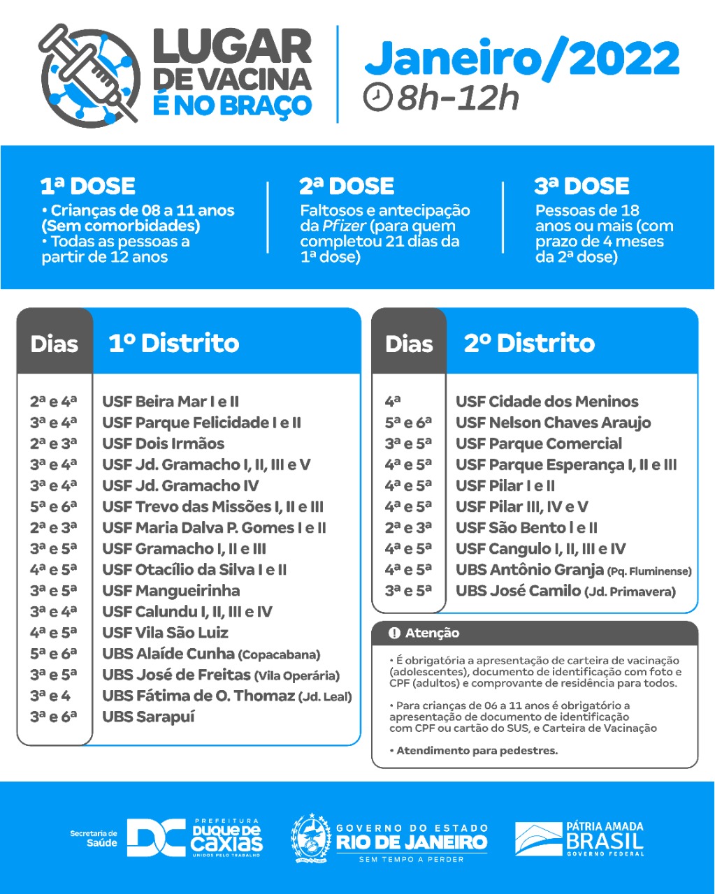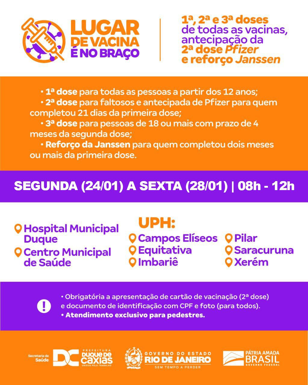 * VACINAÇÃO COM TODAS AS DOSES PARA 12 ANOS OU MAIS - Durante toda a semana (24 a 28/01), o município aplicará também a dose de reforço da Janssen (para quem já completou dois meses ou mais da primeira dose); a primeira dose (para pessoas acima de 12 anos), segunda dose de Pfizer antecipada (para aqueles que estão completando 21 dias da primeira dose), segunda dose para os faltosos de todas as vacinas e terceira dose para pessoas de 18 anos ou mais com prazo de 4 meses de recebimento da segunda dose. É obrigatória a apresentação de carteira de vacinação (segunda e terceira doses) e documentos de identificação com CPF e foto (todos os grupos).