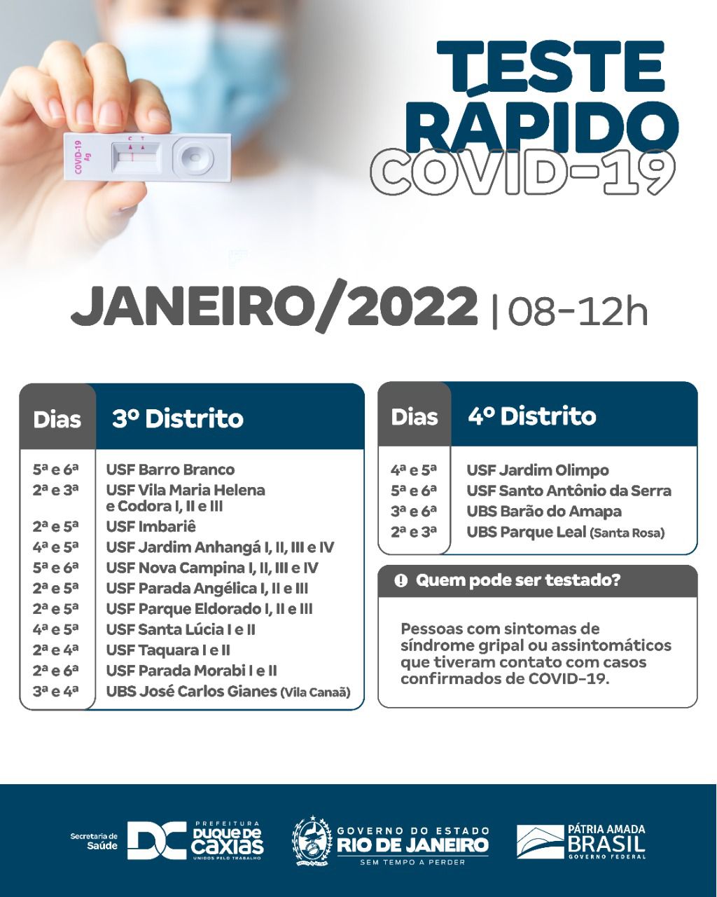 Confira os dias e as unidades da rede de Atenção Básica (ESFs e UBSs) que fazem a testagem rápida e a vacinação de Crianças de 08 a 11 anos (Sem comorbidades), adolescentes (a partir de 12 anos) e adultos, durante o mês de janeiro, acessando o link do PDF: https://drive.google.com/file/d/1IVf-k75vWpo8V-U7PO_SuXMy4QgtpDu1/view?usp=sharing