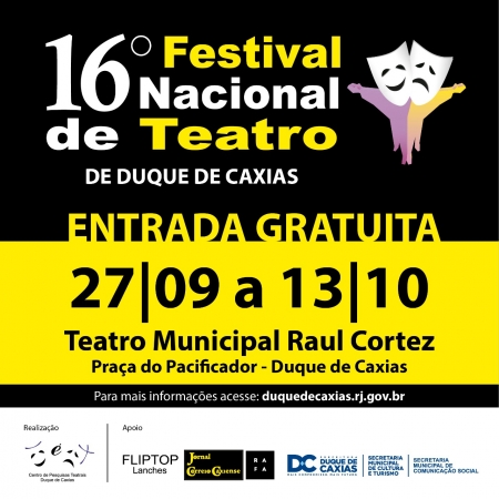 O município de Duque de Caxias recebe, entre os dias 27 de setembro e 13 de outubro, no Teatro Municipal Raul Cortez (Praça do Pacificador, Centro), o 16° Festival Nacional de Teatro de Duque de Caxias, com dezenas de espetáculos gratuitos, voltados para públicos de todas as idades.