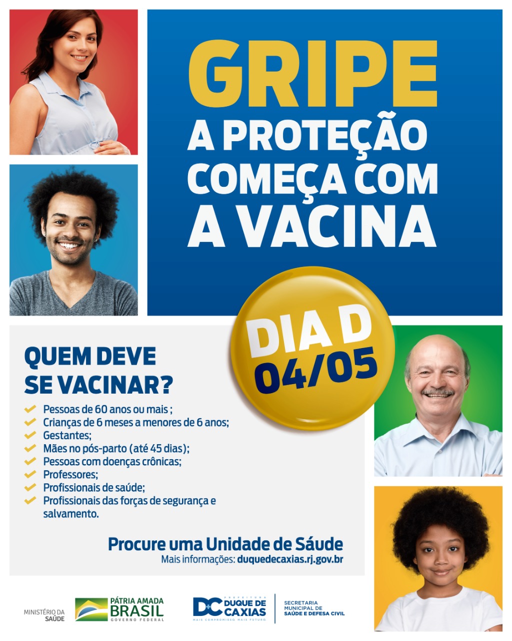 A Prefeitura de Duque de Caxias, através da Secretaria Municipal de Saúde, promove neste sábado, 04 de maio, o Dia D da Campanha Nacional de Vacinação contra a Gripe (H1N1). Dezenas de unidades de saúde no município estarão atendendo a população, das 8h às 17h, para a aplicação da vacina. O objetivo do Dia D é de intensificar e alcançar o maior número de pessoas que fazem parte do grupo de risco, as mais vulneráveis aos efeitos da gripe.