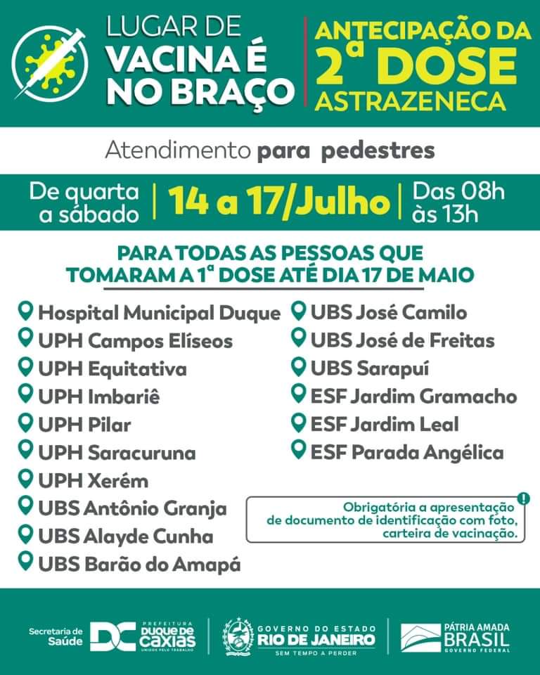 A Prefeitura de Duque de Caxias segue neste sábado (17/07), com a vacinação antecipada de segunda dose de Astrazeneca, para quem recebeu a primeira dose até o dia 17 de maio. A vacinação antecipada começou a ser adotada em Duque de Caxias, seguindo a recomendação do Governo do Estado, que autoriza a redução do intervalo de aplicação da segunda dose da vacina de 12 para 8 semanas.